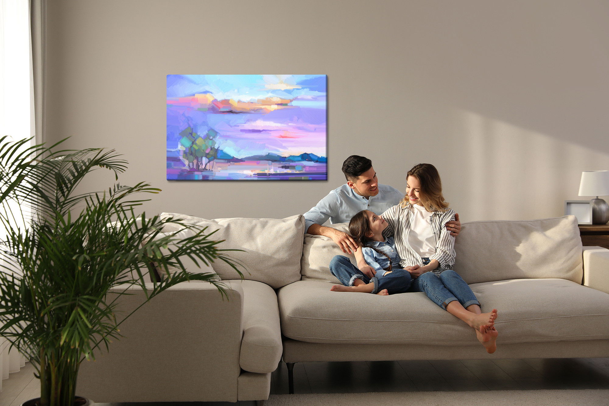 Varje tavla monteras på en massiv fururam. Format upp till 70×50 cm har en ram på 15 mm, medan format från 90×60 cm och uppåt har en ram på 20 mm. Den exakta dukspänningen gör att tavlan håller sin form över tid. Motivet The abstract landscape trycks runt hela ramen vilket ger ett stilrent galleriuttryck där tavlan är lika vacker från sidan som framifrån. Kombinationen av rak dukspänning, rena linjer och korrekt tryck ger en professionell finish.