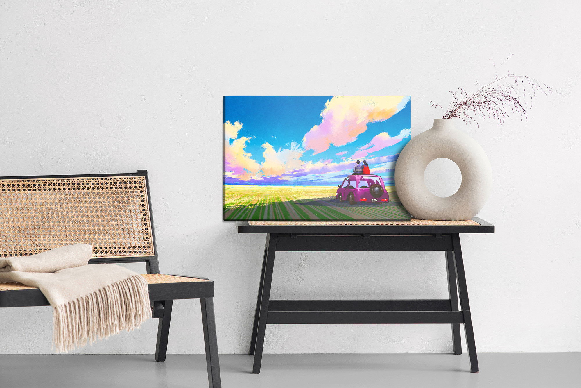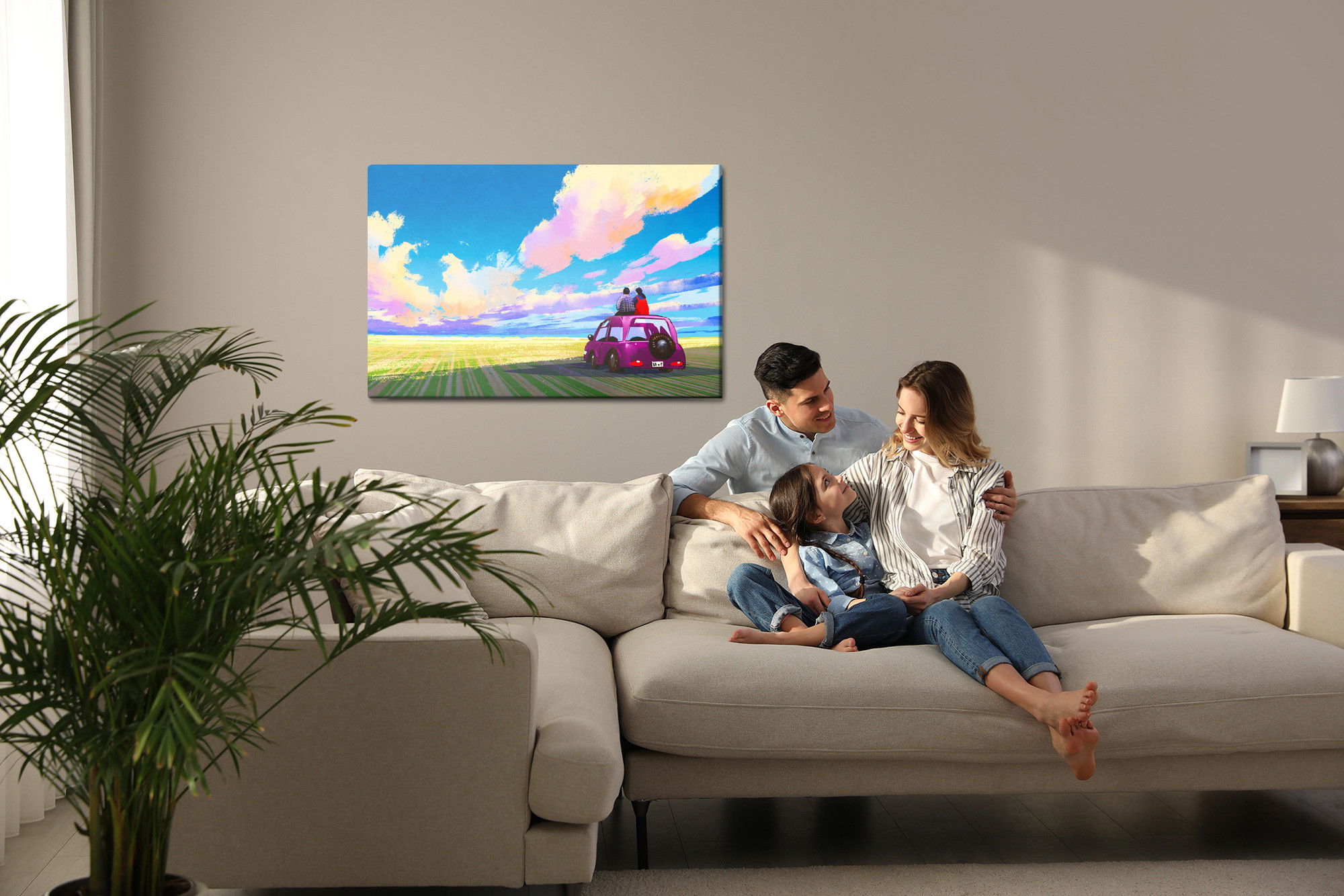 Varje tavla monteras på en massiv fururam. Format upp till 70×50 cm har en ram på 15 mm, medan format från 90×60 cm och uppåt har en ram på 20 mm. Den exakta dukspänningen gör att tavlan håller sin form över tid. Motivet The car and the abstract trycks runt hela ramen vilket ger ett stilrent galleriuttryck där tavlan är lika vacker från sidan som framifrån. Kombinationen av rak dukspänning, rena linjer och korrekt tryck ger en professionell finish.