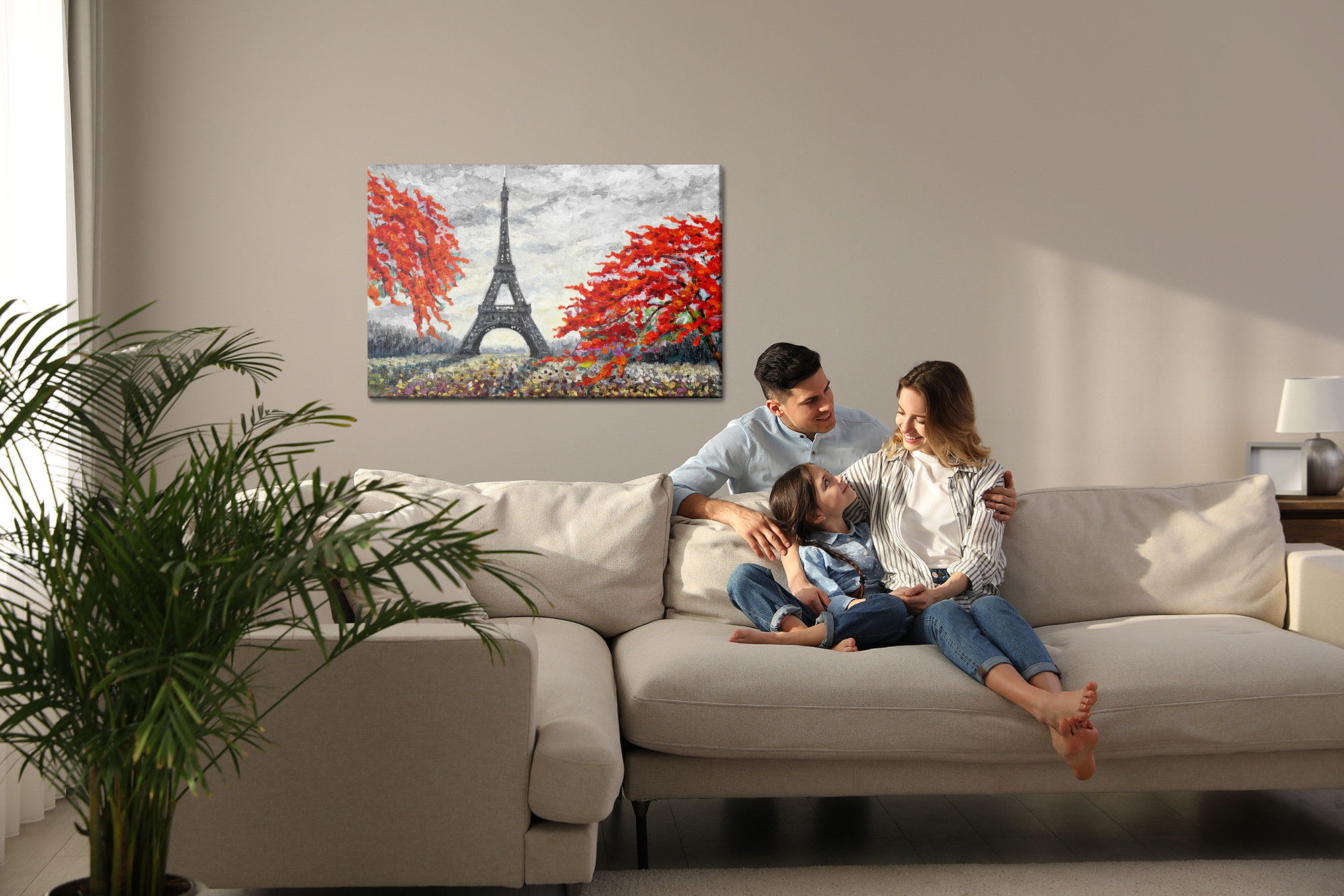 Motivet The eiffel tower between återges med hög färgprecision och detaljrikedom tack vare HP Latex-teknologi. Trycket sker med vattenbaserade, luktfria och GREENGUARD Gold-certifierade bläck som ger en upplösning på upp till 300 DPI. Färgerna är UV-beständiga och behåller sin styrka även i ljusa rum, vilket gör tavlan lämplig för både hem- och offentliga miljöer.