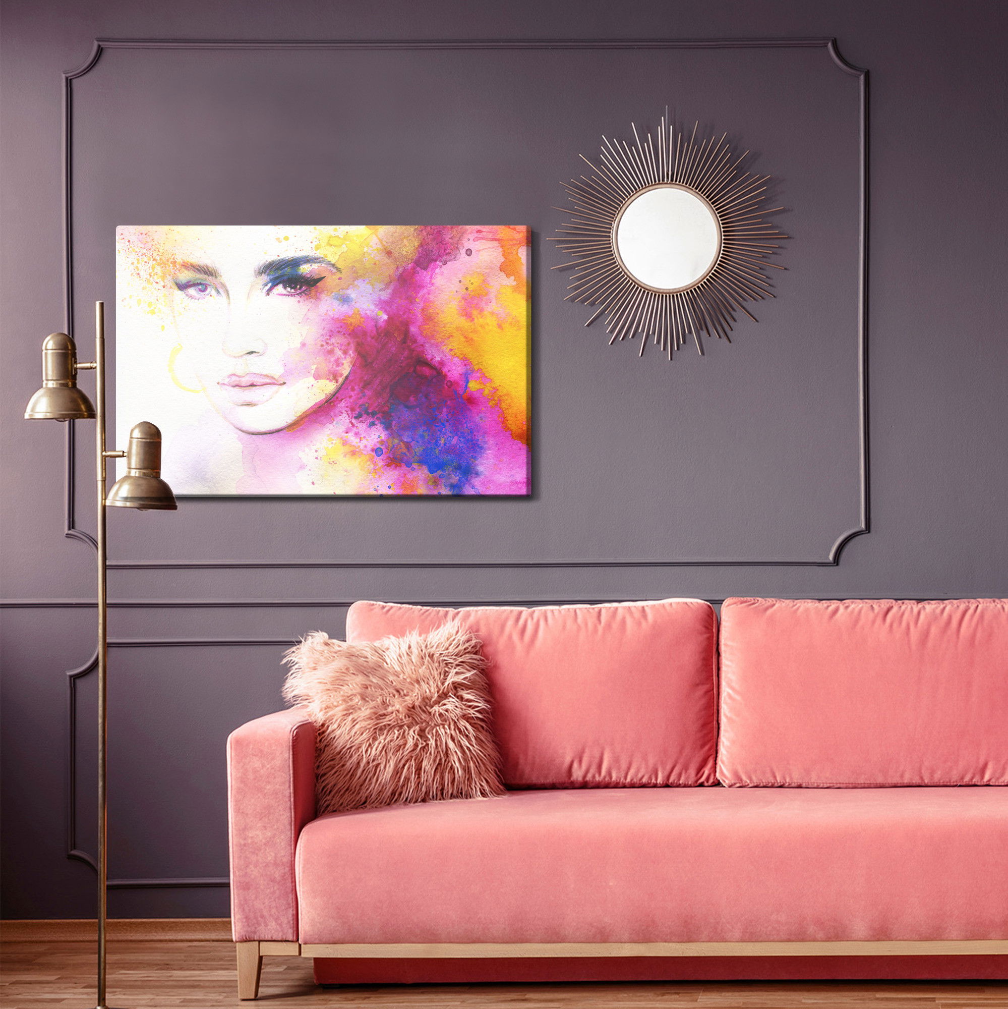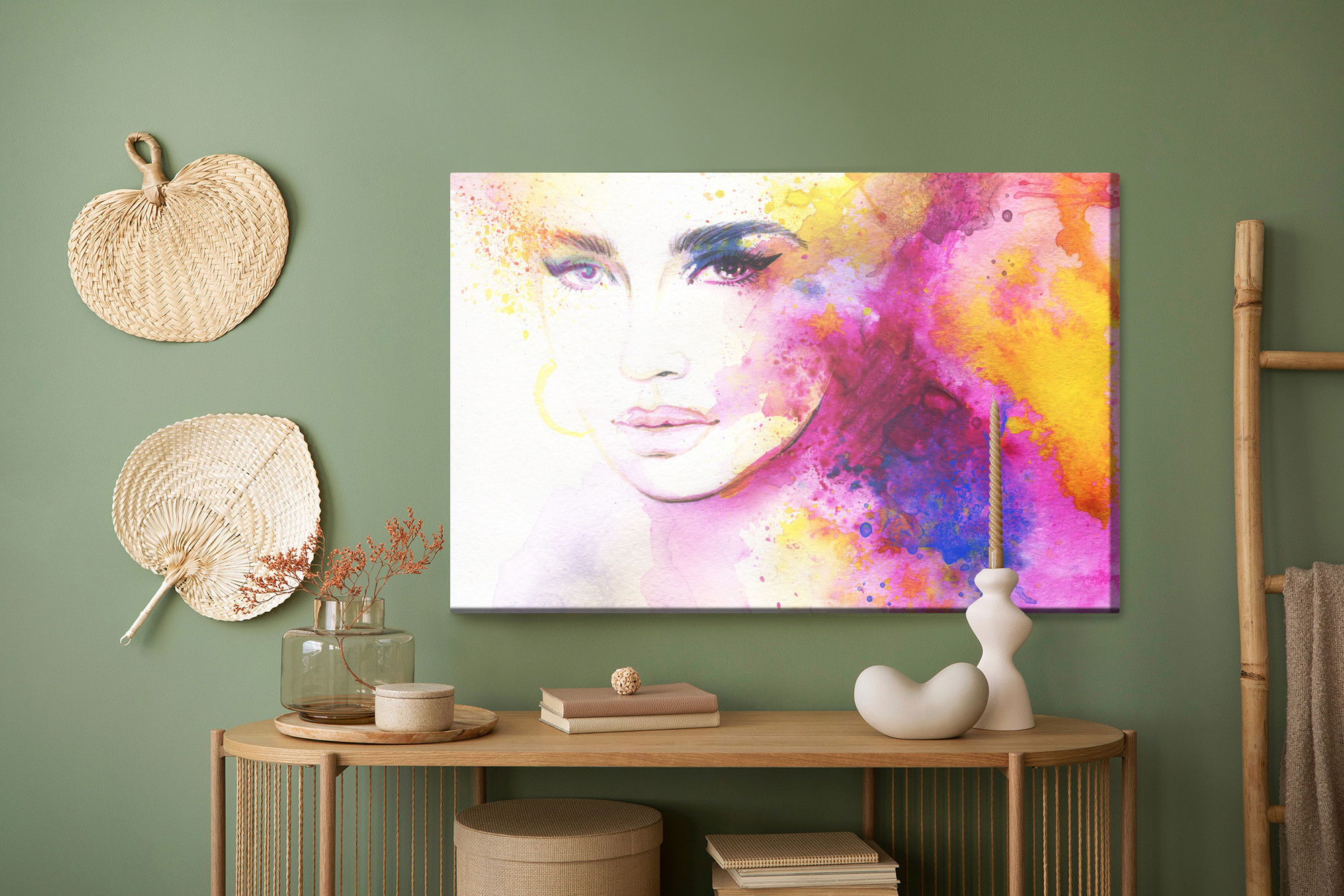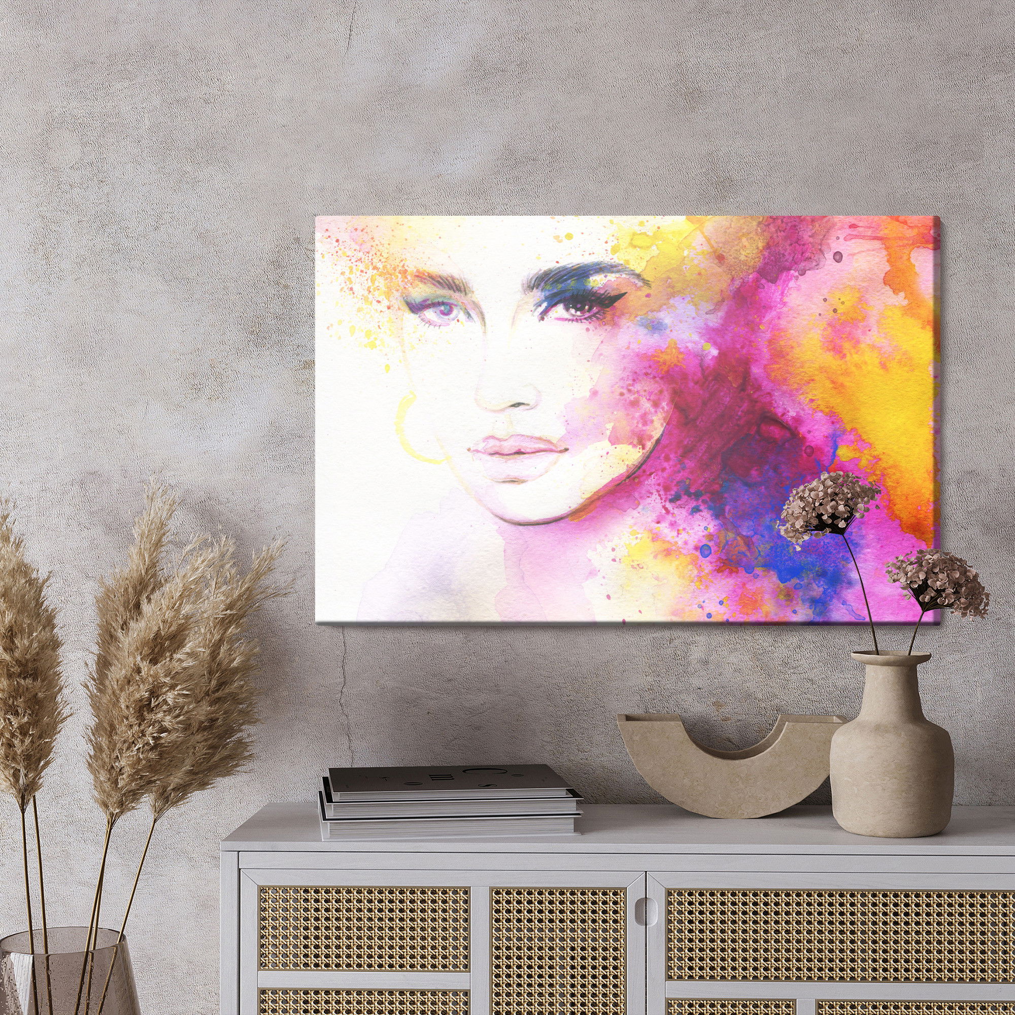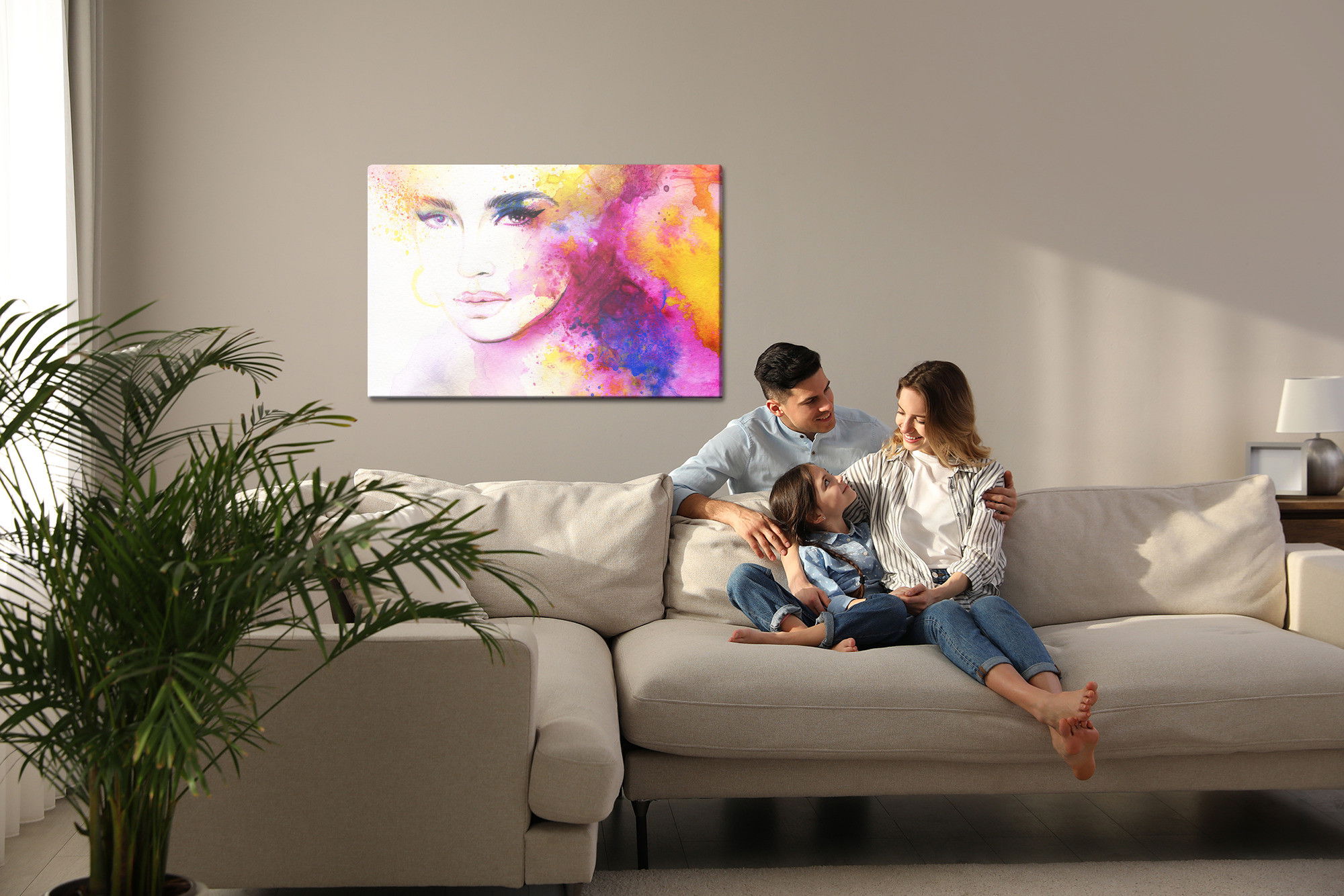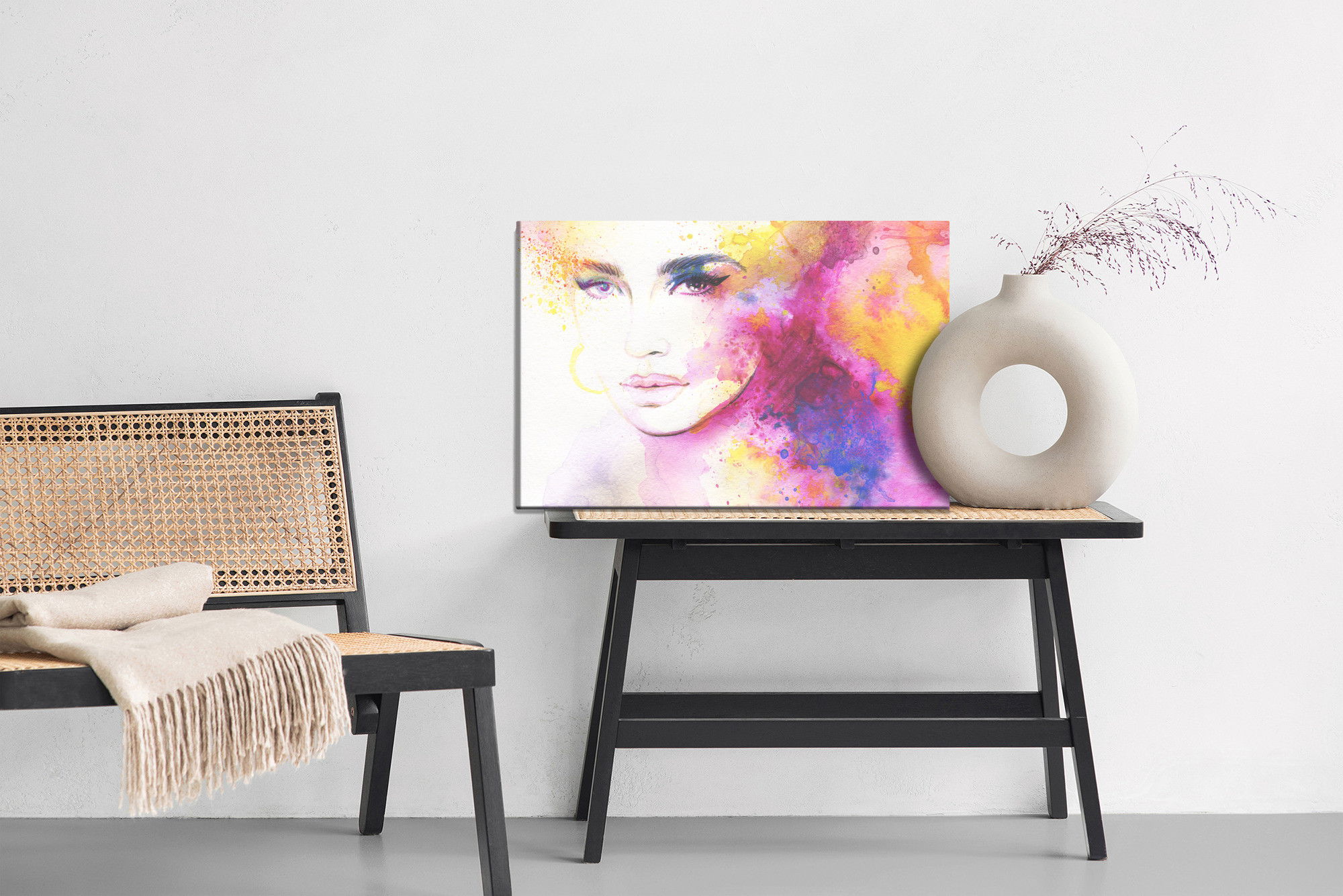 Motivet The face of a woman återges med hög färgprecision och detaljrikedom tack vare HP Latex-teknologi. Trycket sker med vattenbaserade, luktfria och GREENGUARD Gold-certifierade bläck som ger en upplösning på upp till 300 DPI. Färgerna är UV-beständiga och behåller sin styrka även i ljusa rum, vilket gör tavlan lämplig för både hem- och offentliga miljöer.