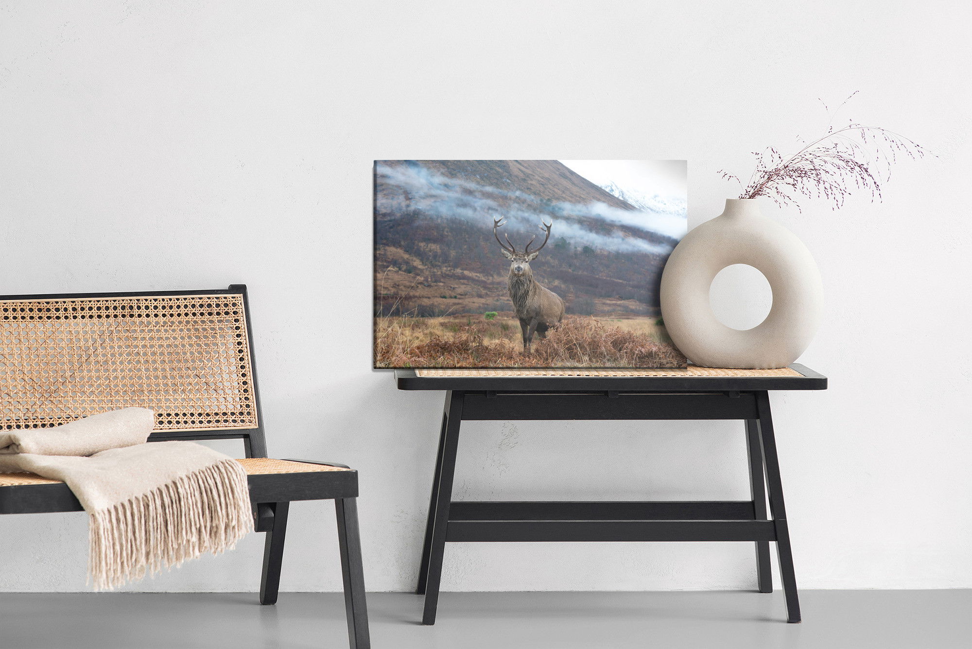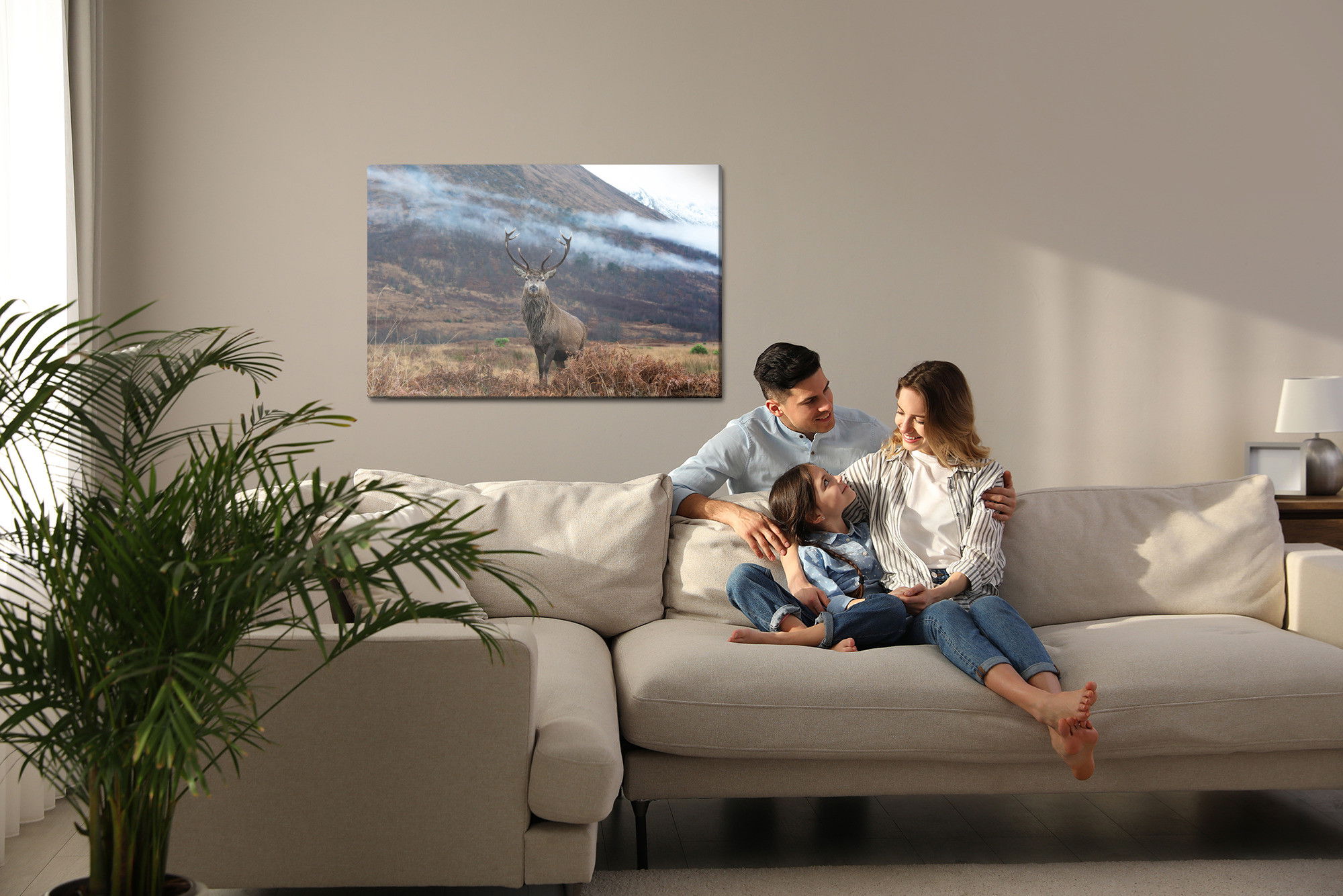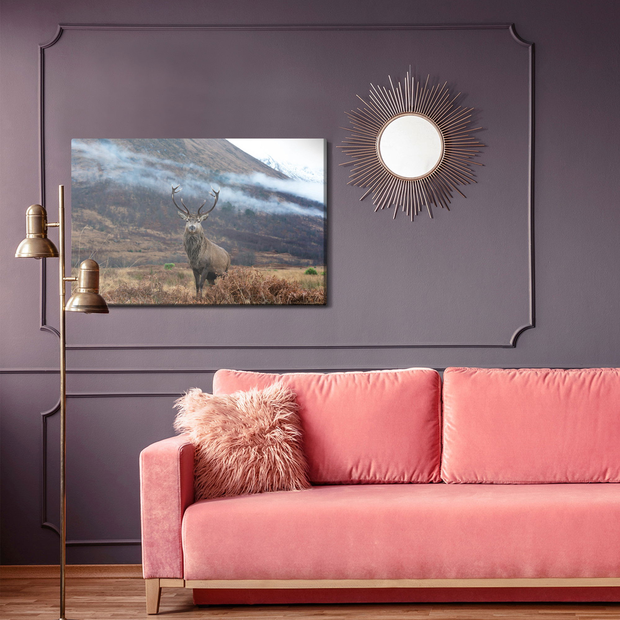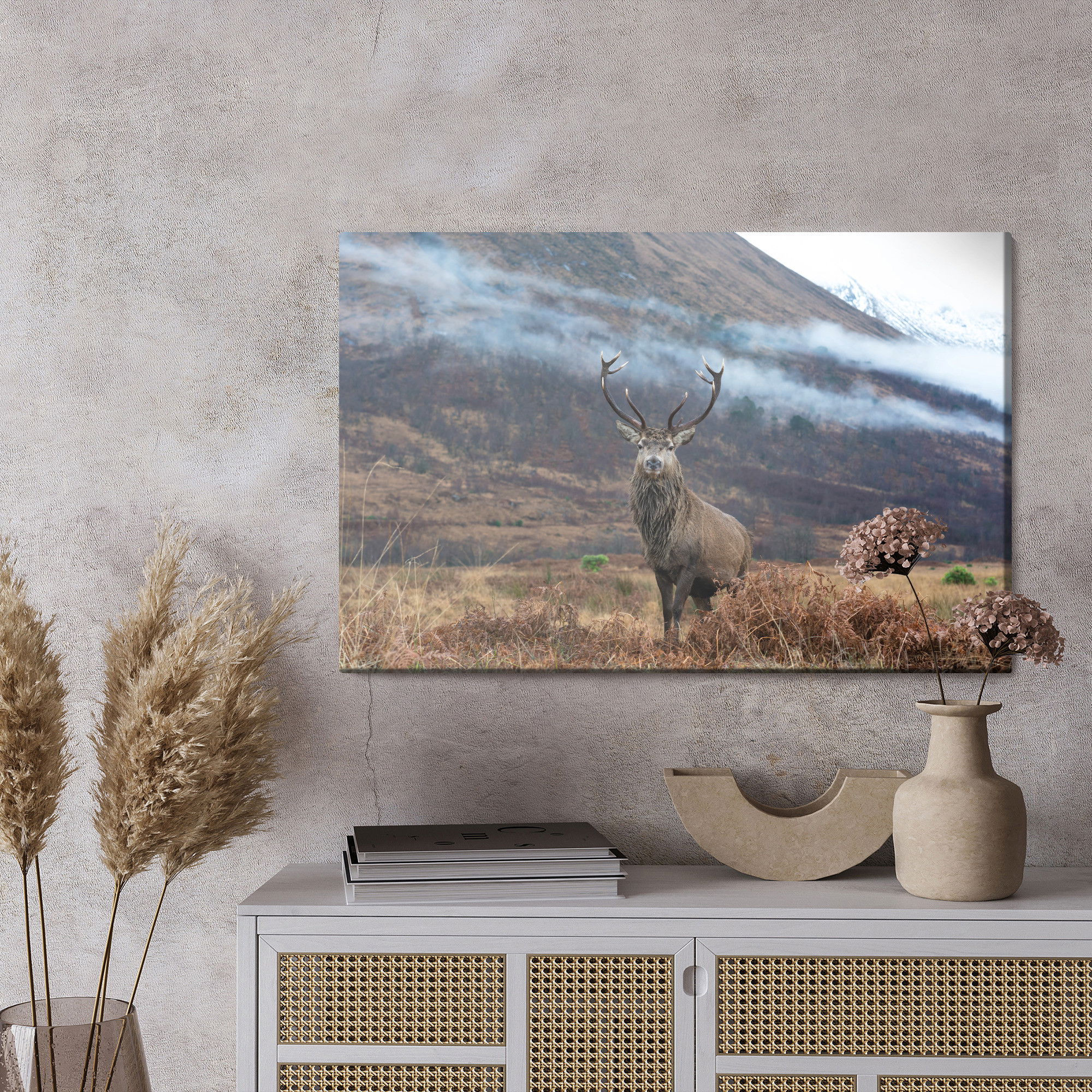 Varje tavla monteras på en massiv fururam. Format upp till 70×50 cm har en ram på 15 mm, medan format från 90×60 cm och uppåt har en ram på 20 mm. Den exakta dukspänningen gör att tavlan håller sin form över tid. Motivet The majestic deer against trycks runt hela ramen vilket ger ett stilrent galleriuttryck där tavlan är lika vacker från sidan som framifrån. Kombinationen av rak dukspänning, rena linjer och korrekt tryck ger en professionell finish.