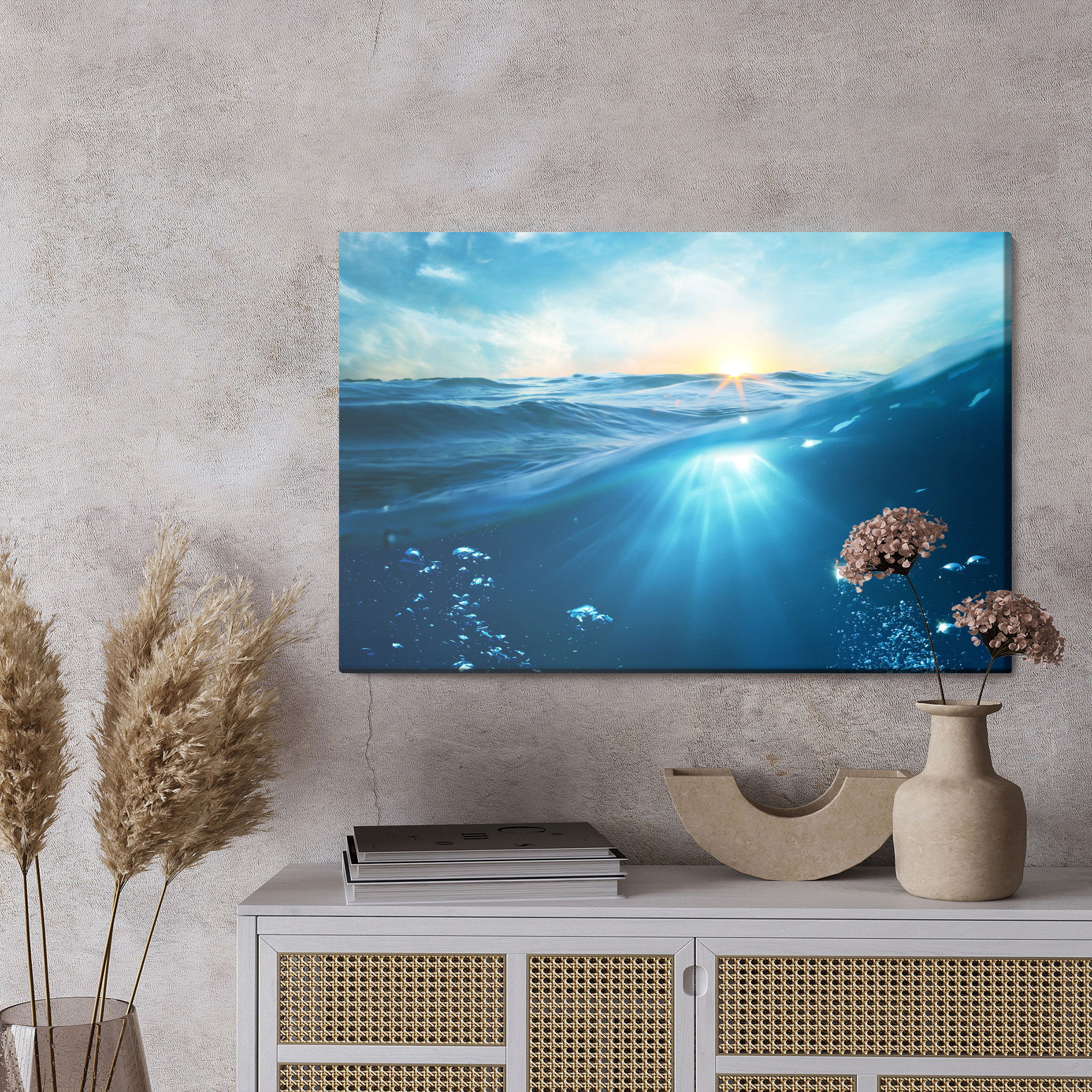 Varje tavla monteras på en massiv fururam. Format upp till 70×50 cm har en ram på 15 mm, medan format från 90×60 cm och uppåt har en ram på 20 mm. Den exakta dukspänningen gör att tavlan håller sin form över tid. Motivet The underwater world trycks runt hela ramen vilket ger ett stilrent galleriuttryck där tavlan är lika vacker från sidan som framifrån. Kombinationen av rak dukspänning, rena linjer och korrekt tryck ger en professionell finish.