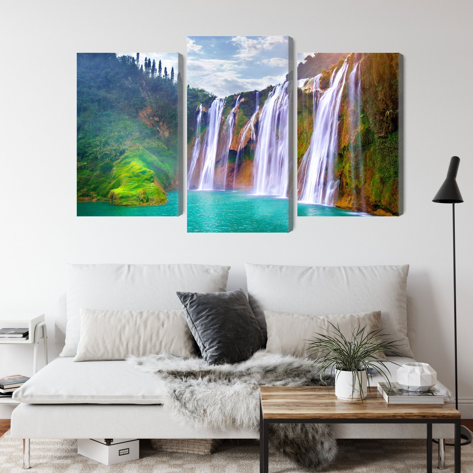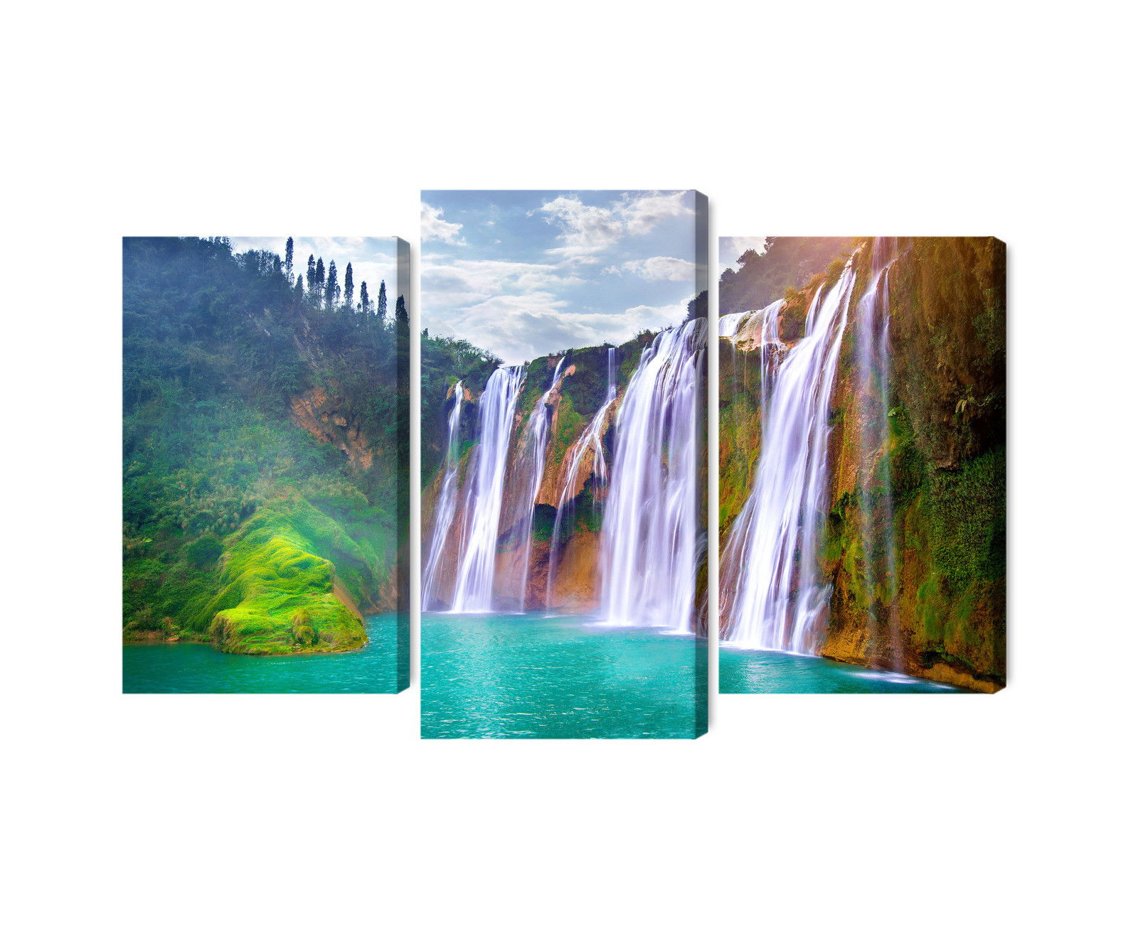 Varje tavla monteras på en massiv fururam. Format upp till 70×50 cm har en ram på 15 mm, medan format från 90×60 cm och uppåt har en ram på 20 mm. Den exakta dukspänningen gör att tavlan håller sin form över tid. Motivet The waterfall in luoping trycks runt hela ramen vilket ger ett stilrent galleriuttryck där tavlan är lika vacker från sidan som framifrån. Kombinationen av rak dukspänning, rena linjer och korrekt tryck ger en professionell finish.