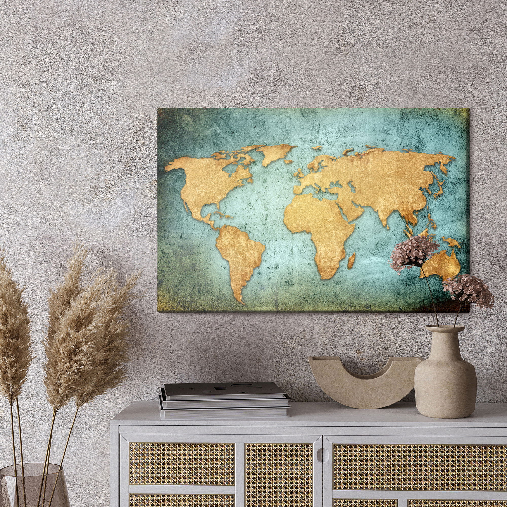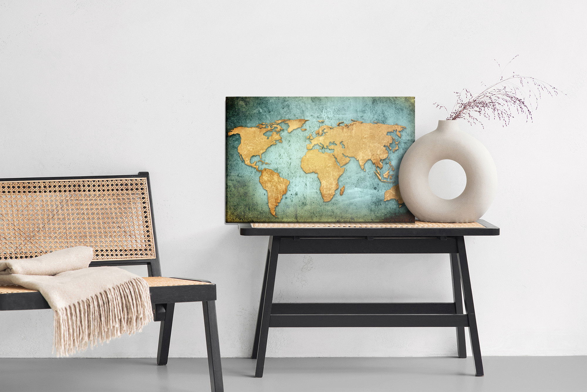 Motivet The world map återges med hög färgprecision och detaljrikedom tack vare HP Latex-teknologi. Trycket sker med vattenbaserade, luktfria och GREENGUARD Gold-certifierade bläck som ger en upplösning på upp till 300 DPI. Färgerna är UV-beständiga och behåller sin styrka även i ljusa rum, vilket gör tavlan lämplig för både hem- och offentliga miljöer.