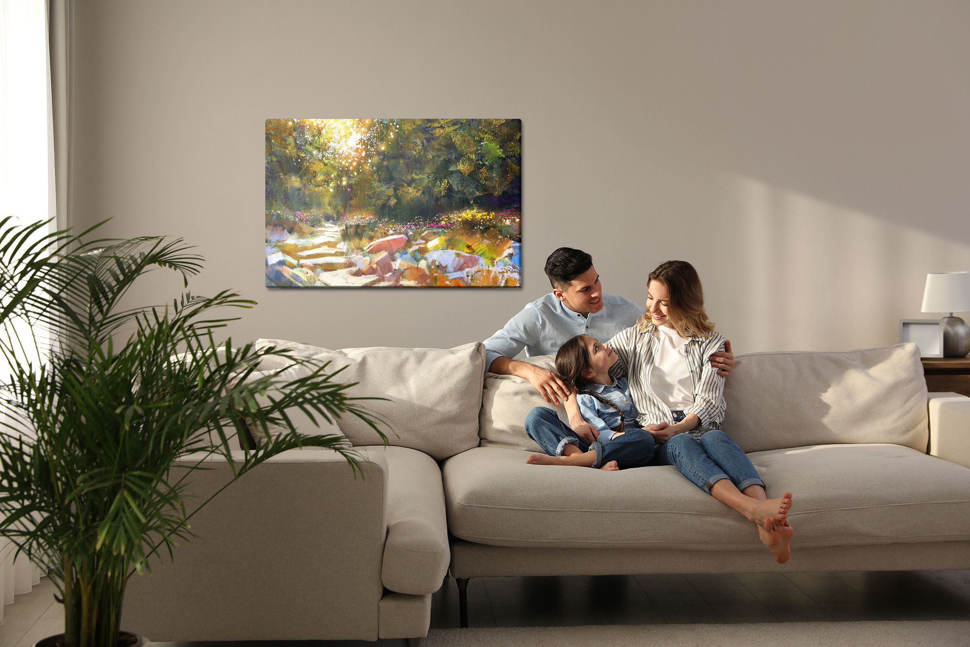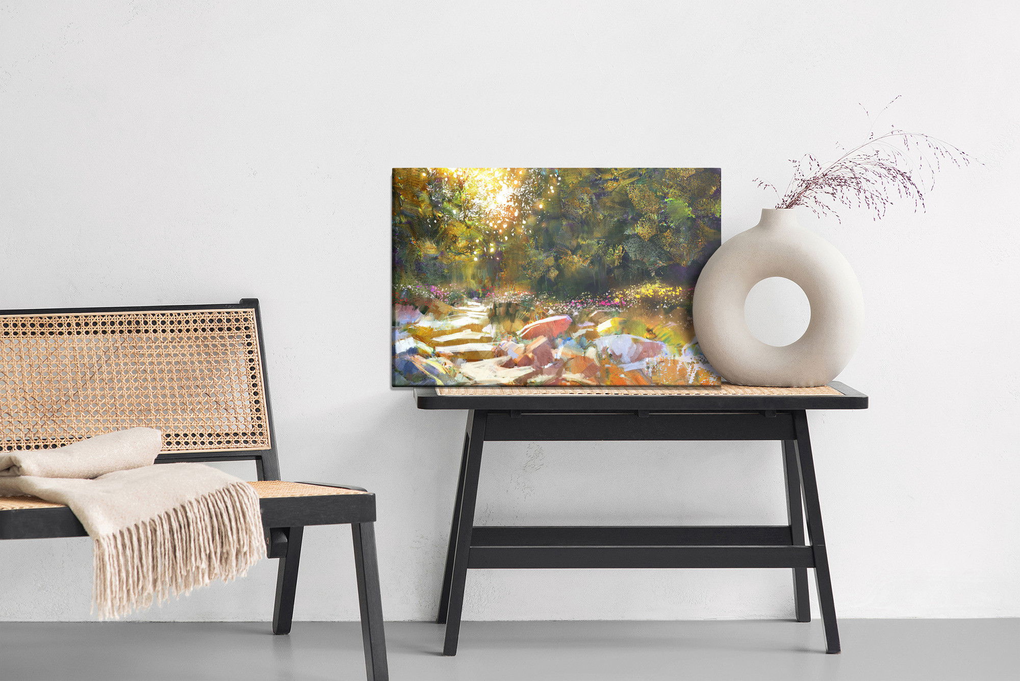 Placera tavlan där du upplever mycket eko eller hög ljudnivå, till exempel i öppna planlösningar, hemmakontor eller sociala ytor. Motiv i denna kategori gör sig särskilt bra i rum där du vill skapa en genomtänkt och sammanhängande känsla. Landskap och naturmotiv tillför en organisk mjukhet där färger och former skapar ett harmoniskt intryck som fungerar i både ljusa och mer dämpade interiörer.