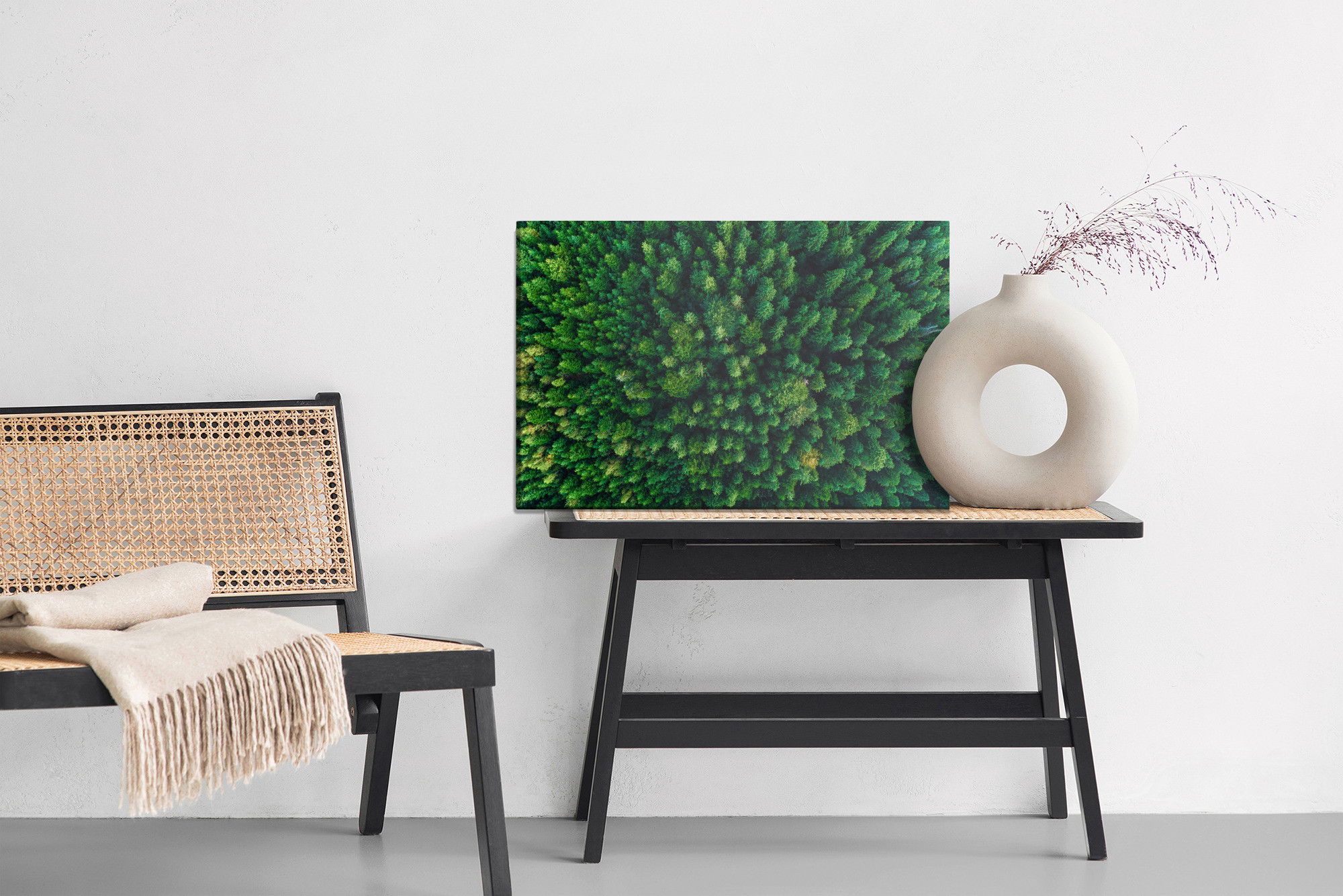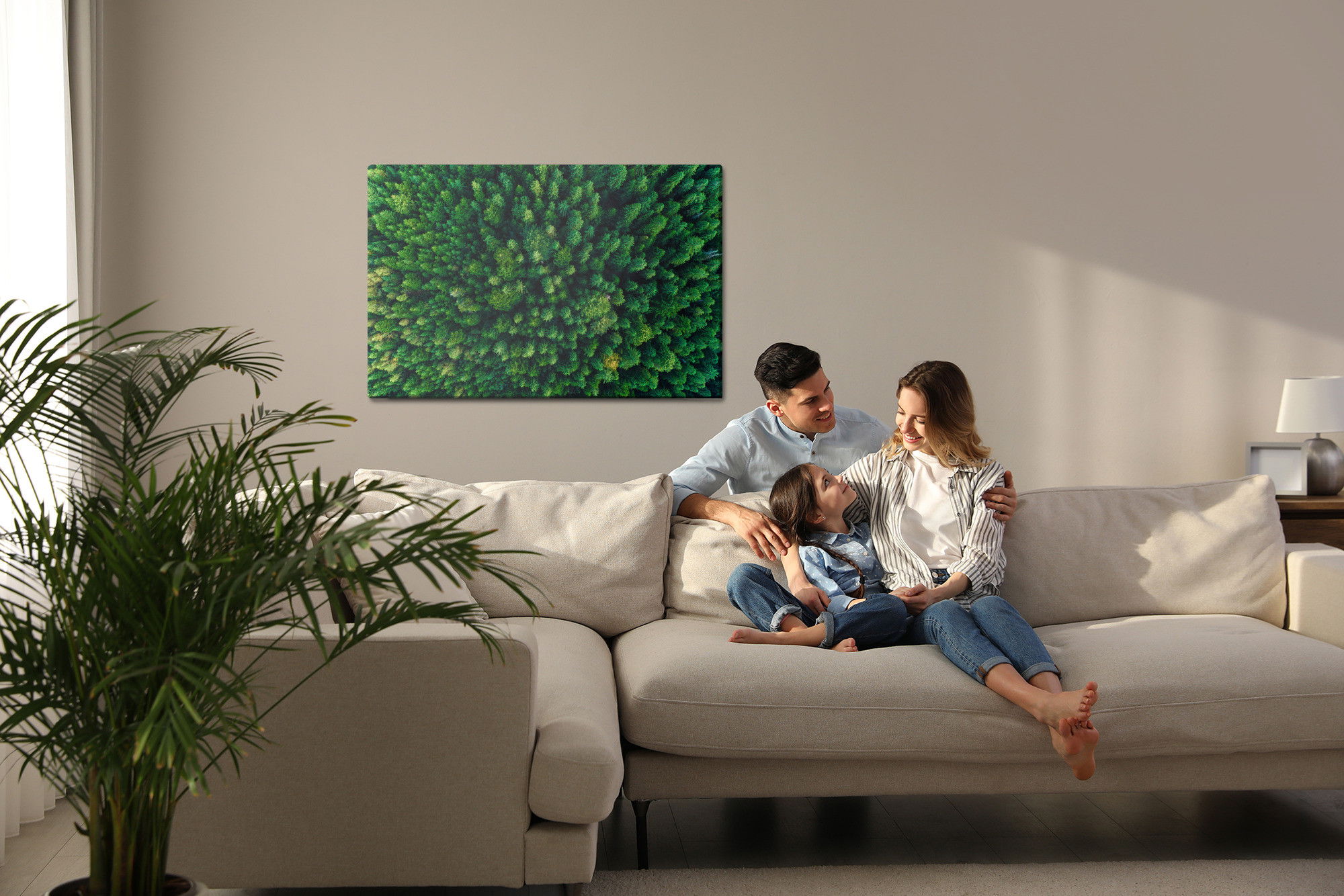 SilentDirects ljuddämpande tavla Trees in the carpathians kombinerar ett högupplöst motiv med avancerad akustikteknik. Varje tavla monteras i Sverige och bygger på en stabil canvastavla med fururam, där insidan av ramen fylls med en ljudabsorberande kärna av återvunnen polyester. Konstruktionen gör tavlan till ett både estetiskt och funktionellt inslag i rummet.