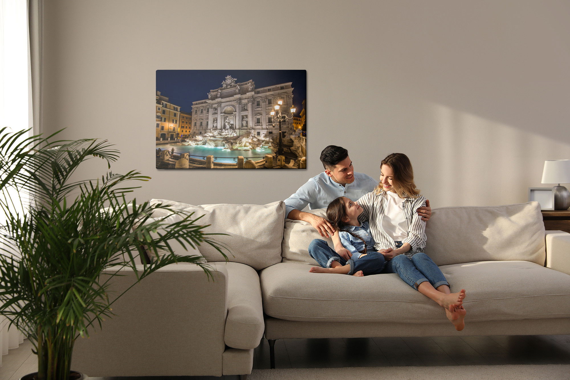 Motivet Trevi fountain Rome återges med hög färgprecision och detaljrikedom tack vare HP Latex-teknologi. Trycket sker med vattenbaserade, luktfria och GREENGUARD Gold-certifierade bläck som ger en upplösning på upp till 300 DPI. Färgerna är UV-beständiga och behåller sin styrka även i ljusa rum, vilket gör tavlan lämplig för både hem- och offentliga miljöer.