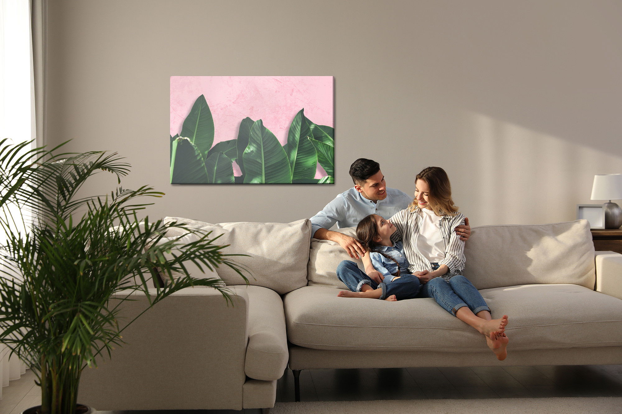 Varje tavla monteras på en massiv fururam. Format upp till 70×50 cm har en ram på 15 mm, medan format från 90×60 cm och uppåt har en ram på 20 mm. Den exakta dukspänningen gör att tavlan håller sin form över tid. Motivet Tropical plants on a pink trycks runt hela ramen vilket ger ett stilrent galleriuttryck där tavlan är lika vacker från sidan som framifrån. Kombinationen av rak dukspänning, rena linjer och korrekt tryck ger en professionell finish.