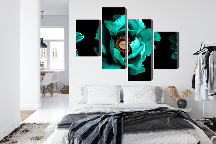 Ljuddämpande tavla – Turquoise flowers on a black för lugnare rum och mjukare akustik