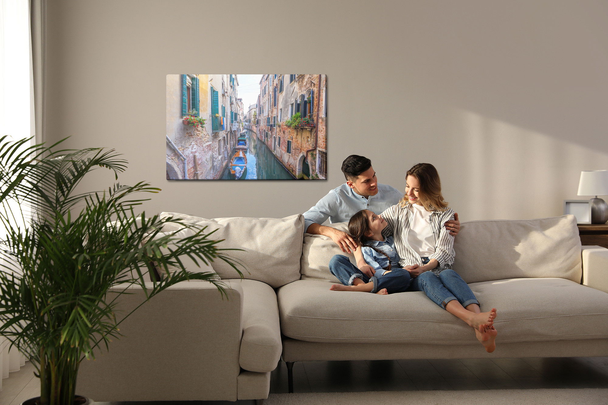 Varje tavla monteras på en massiv fururam. Format upp till 70×50 cm har en ram på 15 mm, medan format från 90×60 cm och uppåt har en ram på 20 mm. Den exakta dukspänningen gör att tavlan håller sin form över tid. Motivet Venetian views trycks runt hela ramen vilket ger ett stilrent galleriuttryck där tavlan är lika vacker från sidan som framifrån. Kombinationen av rak dukspänning, rena linjer och korrekt tryck ger en professionell finish.