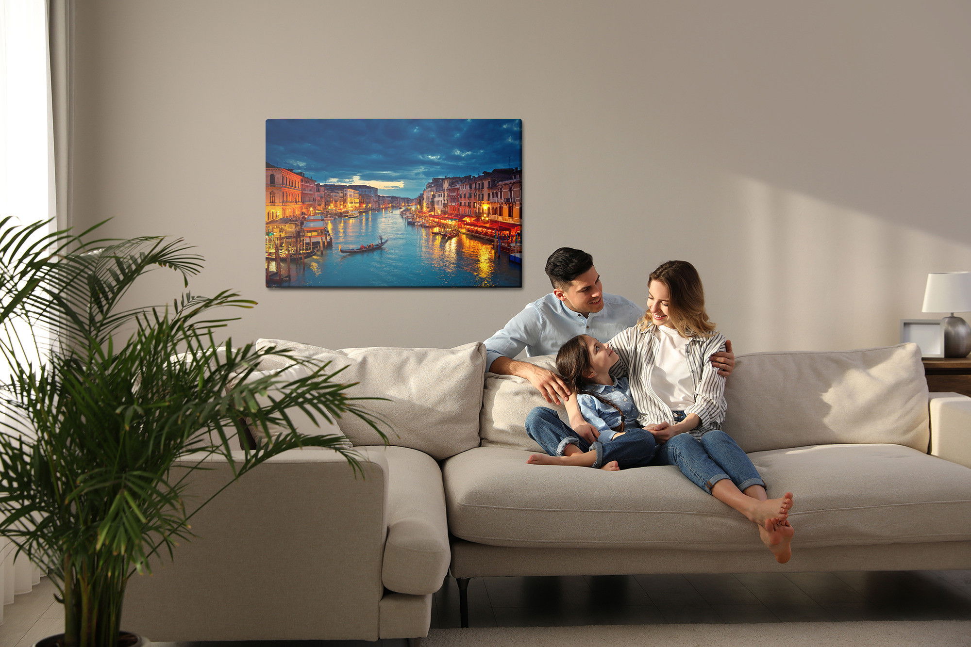 Motivet Venice by night återges med hög färgprecision och detaljrikedom tack vare HP Latex-teknologi. Trycket sker med vattenbaserade, luktfria och GREENGUARD Gold-certifierade bläck som ger en upplösning på upp till 300 DPI. Färgerna är UV-beständiga och behåller sin styrka även i ljusa rum, vilket gör tavlan lämplig för både hem- och offentliga miljöer.