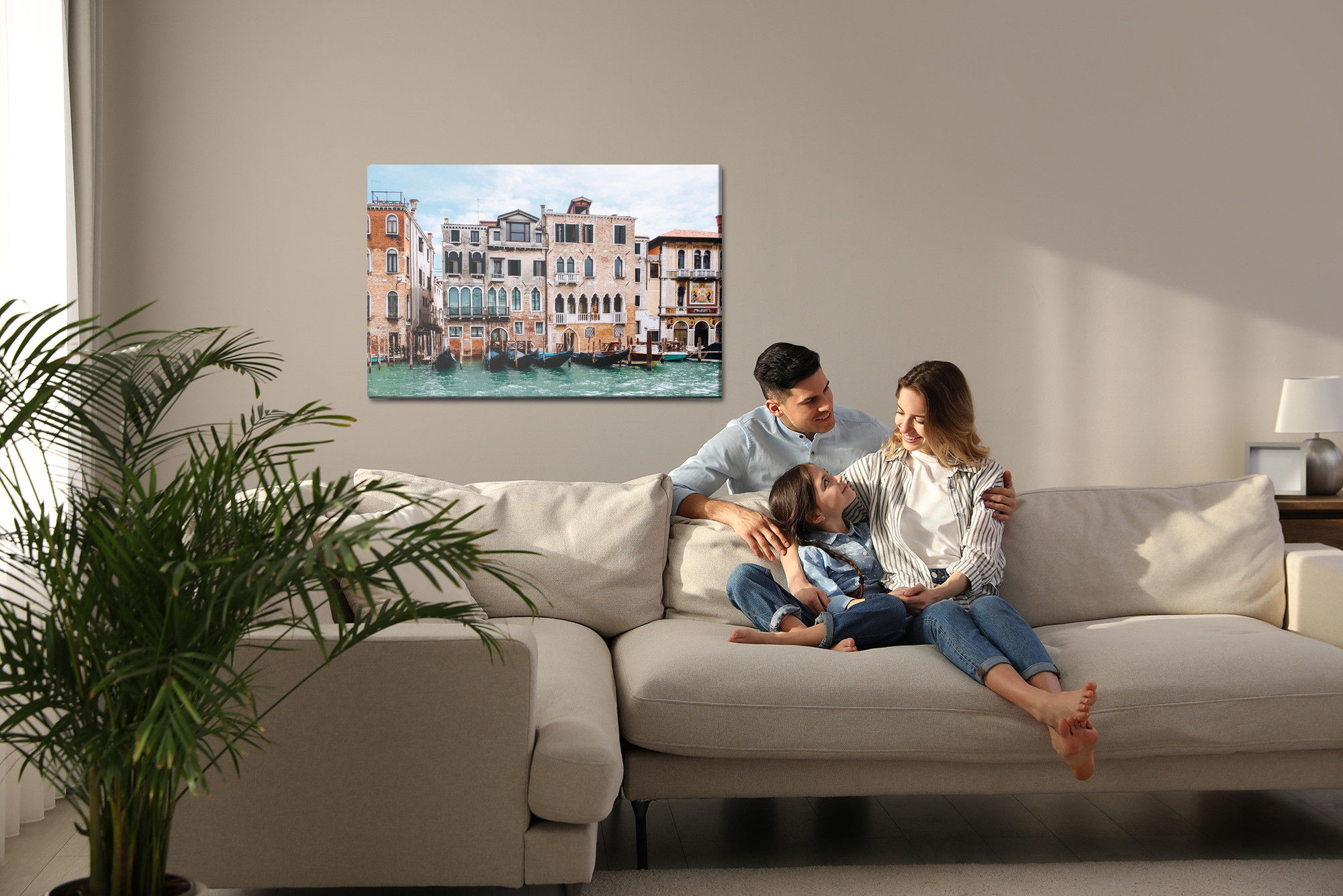 Varje tavla monteras på en massiv fururam. Format upp till 70×50 cm har en ram på 15 mm, medan format från 90×60 cm och uppåt har en ram på 20 mm. Den exakta dukspänningen gör att tavlan håller sin form över tid. Motivet Venice in summer trycks runt hela ramen vilket ger ett stilrent galleriuttryck där tavlan är lika vacker från sidan som framifrån. Kombinationen av rak dukspänning, rena linjer och korrekt tryck ger en professionell finish.
