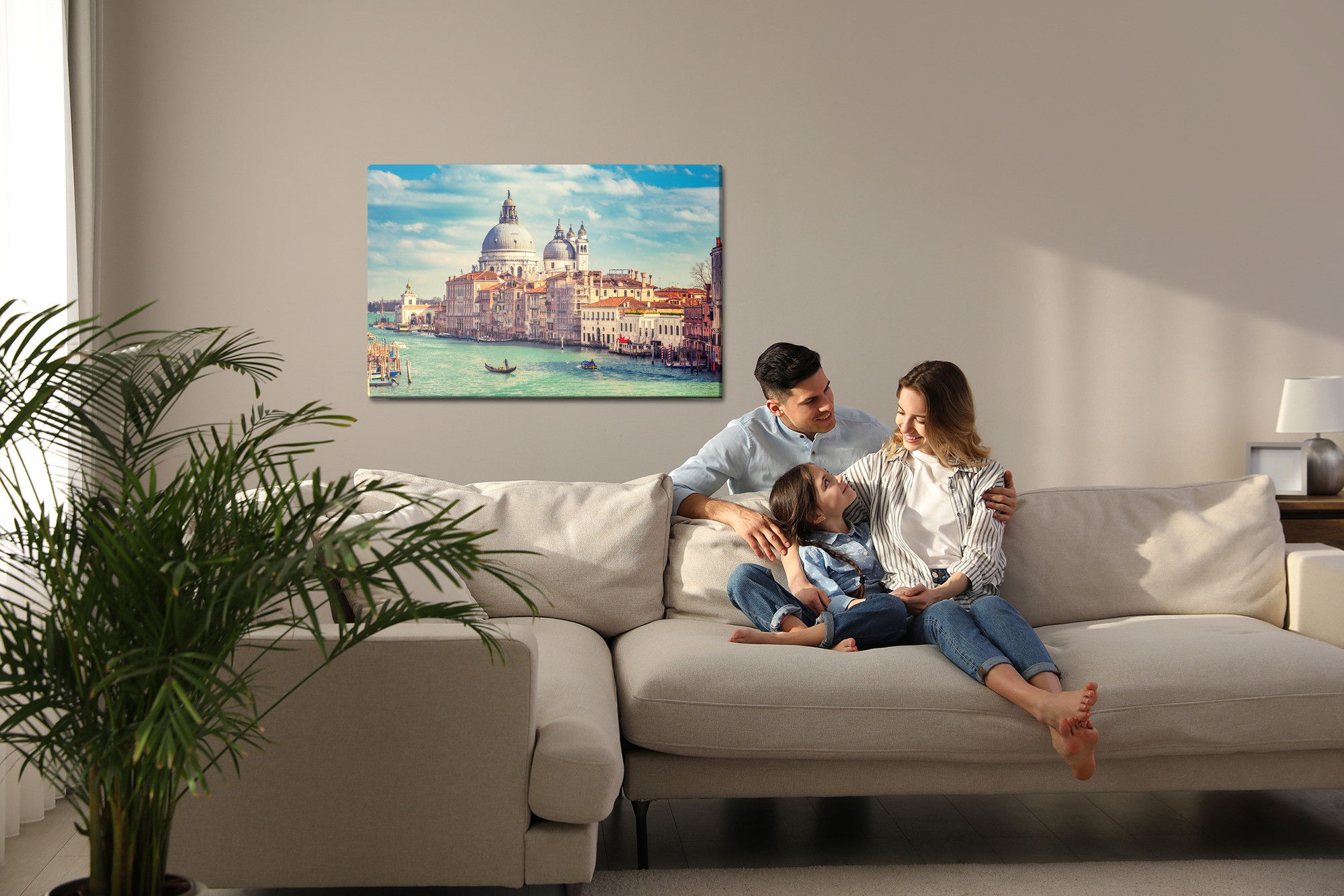 Motivet Venice in sunny weather återges med hög färgprecision och detaljrikedom tack vare HP Latex-teknologi. Trycket sker med vattenbaserade, luktfria och GREENGUARD Gold-certifierade bläck som ger en upplösning på upp till 300 DPI. Färgerna är UV-beständiga och behåller sin styrka även i ljusa rum, vilket gör tavlan lämplig för både hem- och offentliga miljöer.