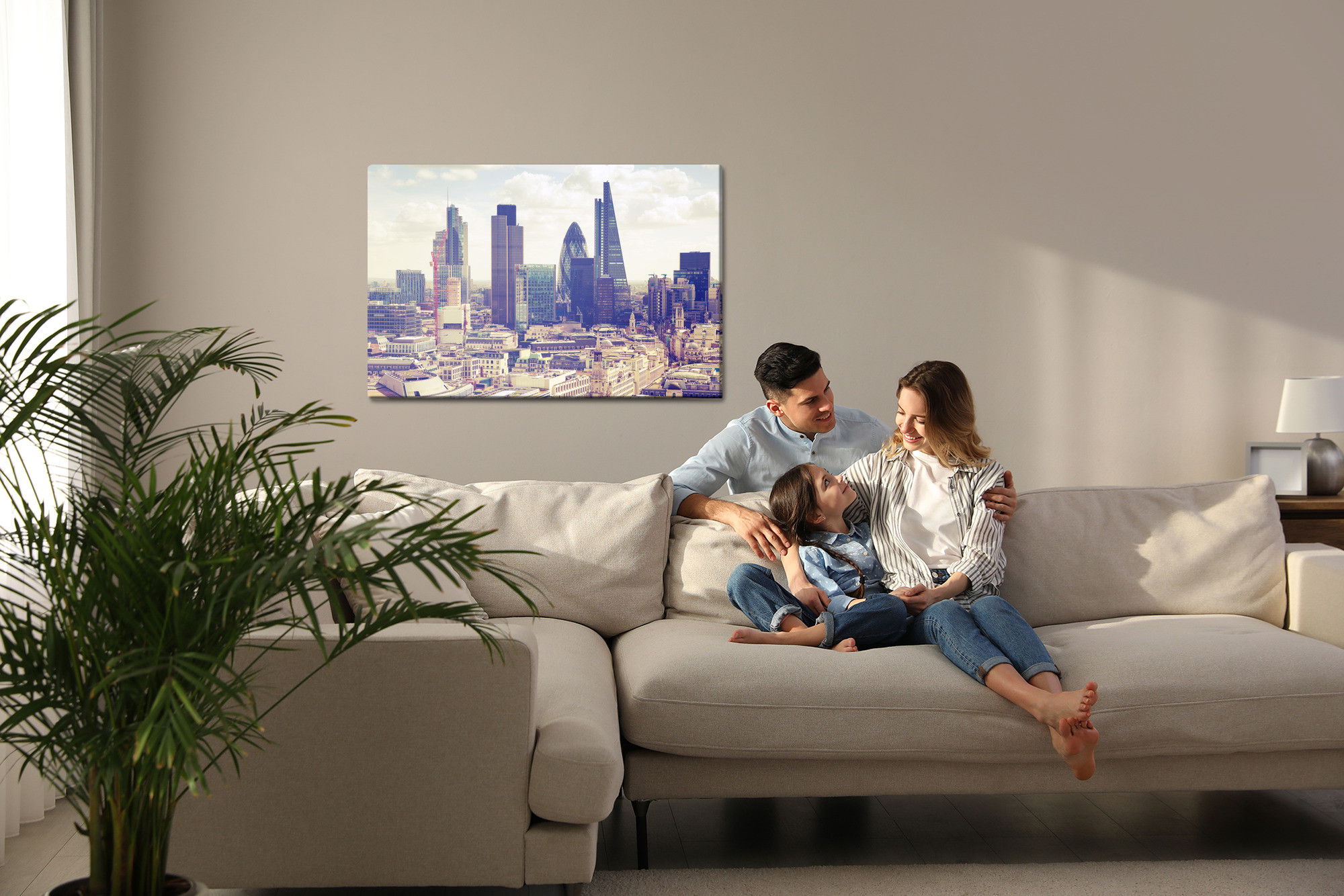 Motivet View of a modern London återges med hög färgprecision och detaljrikedom tack vare HP Latex-teknologi. Trycket sker med vattenbaserade, luktfria och GREENGUARD Gold-certifierade bläck som ger en upplösning på upp till 300 DPI. Färgerna är UV-beständiga och behåller sin styrka även i ljusa rum, vilket gör tavlan lämplig för både hem- och offentliga miljöer.