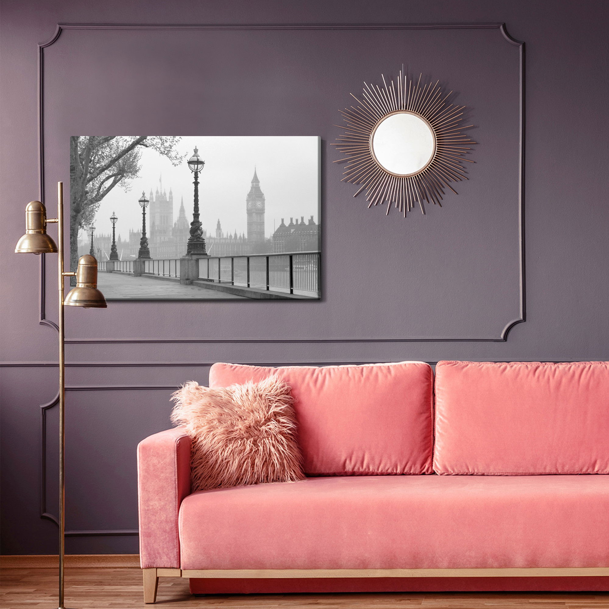 SilentDirects ljuddämpande tavla View of big ben kombinerar ett högupplöst motiv med avancerad akustikteknik. Varje tavla monteras i Sverige och bygger på en stabil canvastavla med fururam, där insidan av ramen fylls med en ljudabsorberande kärna av återvunnen polyester. Konstruktionen gör tavlan till ett både estetiskt och funktionellt inslag i rummet.