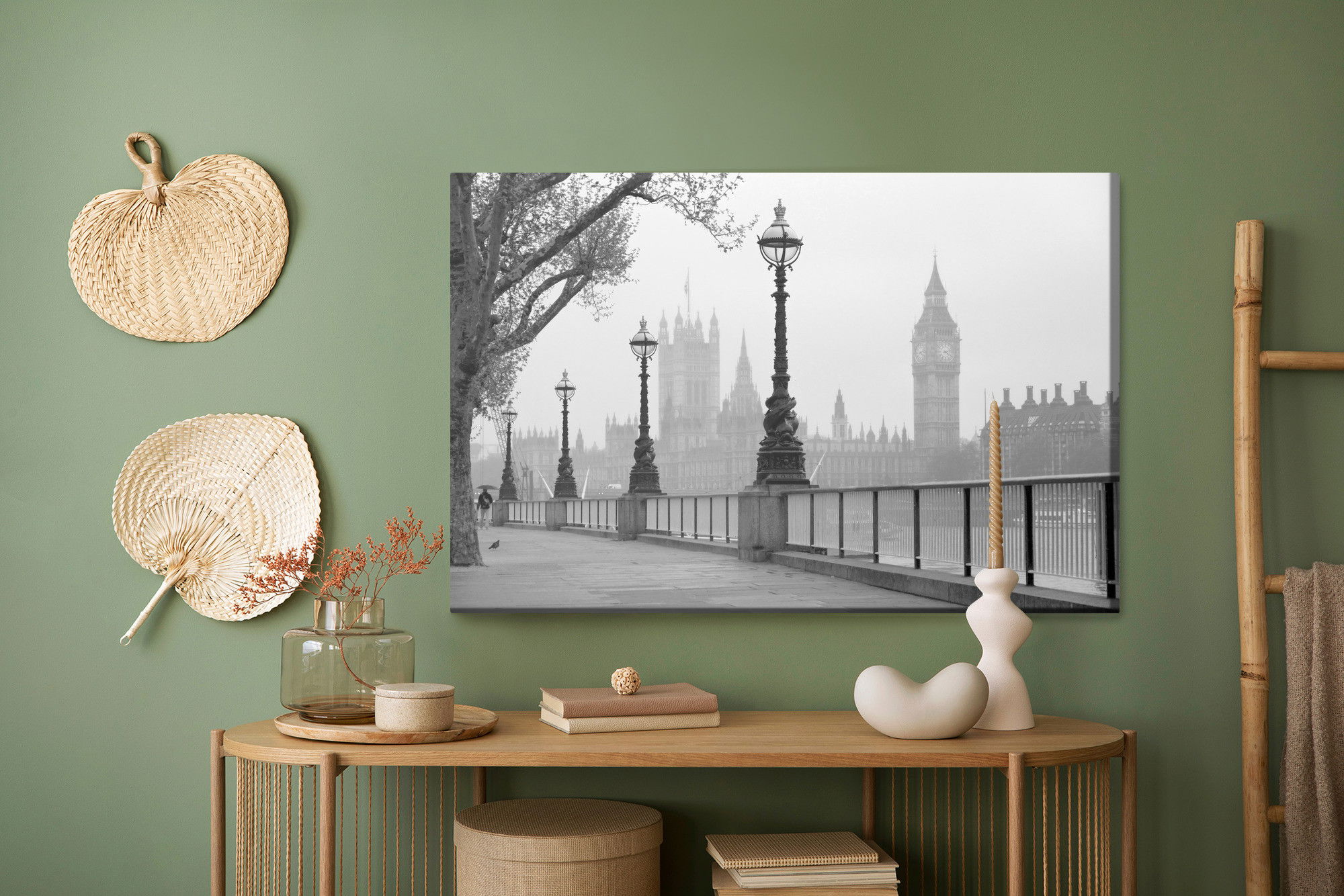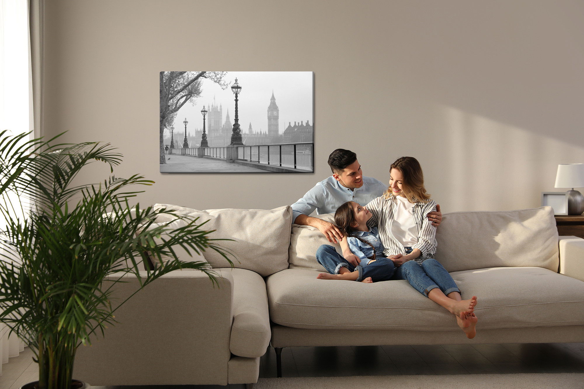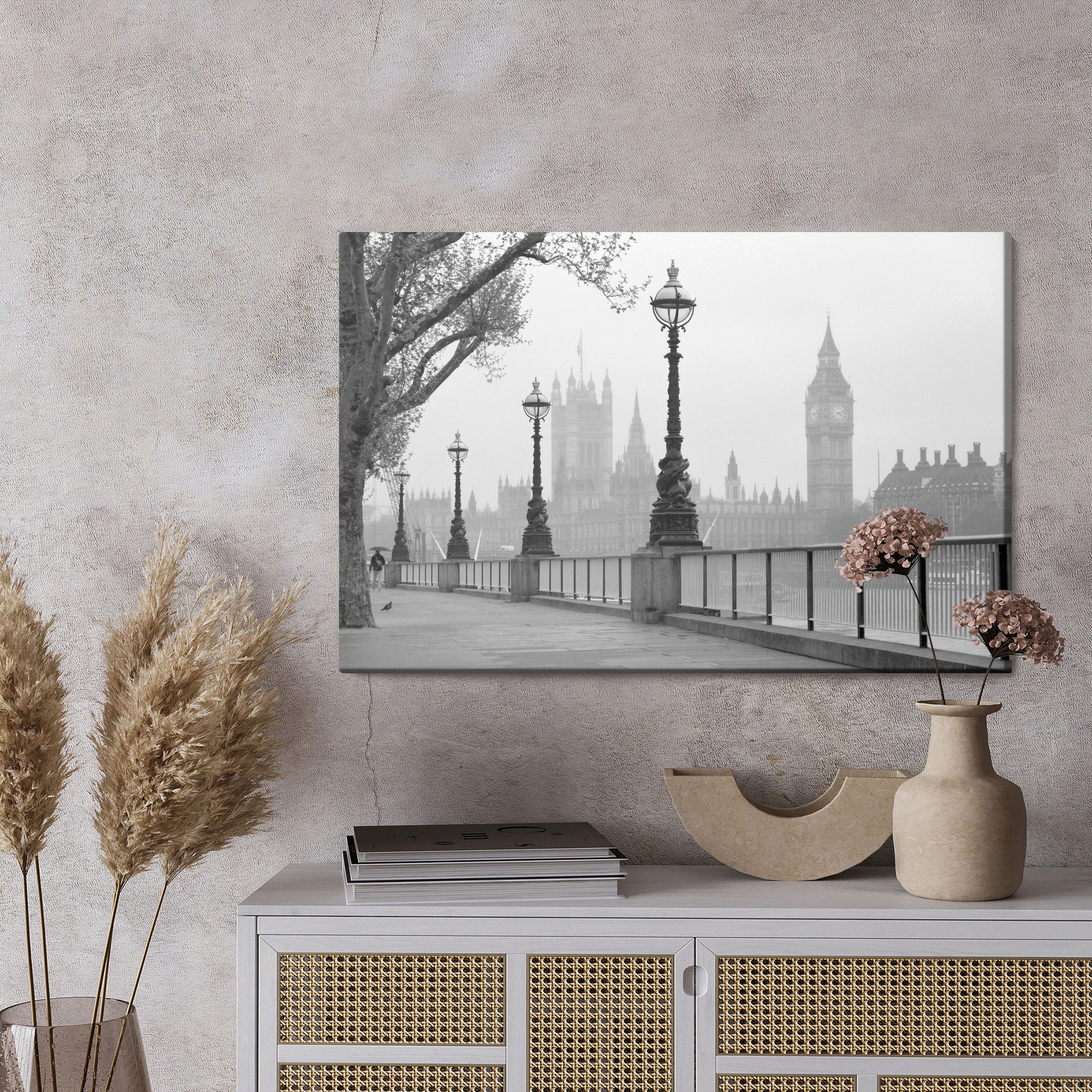 Varje tavla monteras på en massiv fururam. Format upp till 70×50 cm har en ram på 15 mm, medan format från 90×60 cm och uppåt har en ram på 20 mm. Den exakta dukspänningen gör att tavlan håller sin form över tid. Motivet View of big ben trycks runt hela ramen vilket ger ett stilrent galleriuttryck där tavlan är lika vacker från sidan som framifrån. Kombinationen av rak dukspänning, rena linjer och korrekt tryck ger en professionell finish.