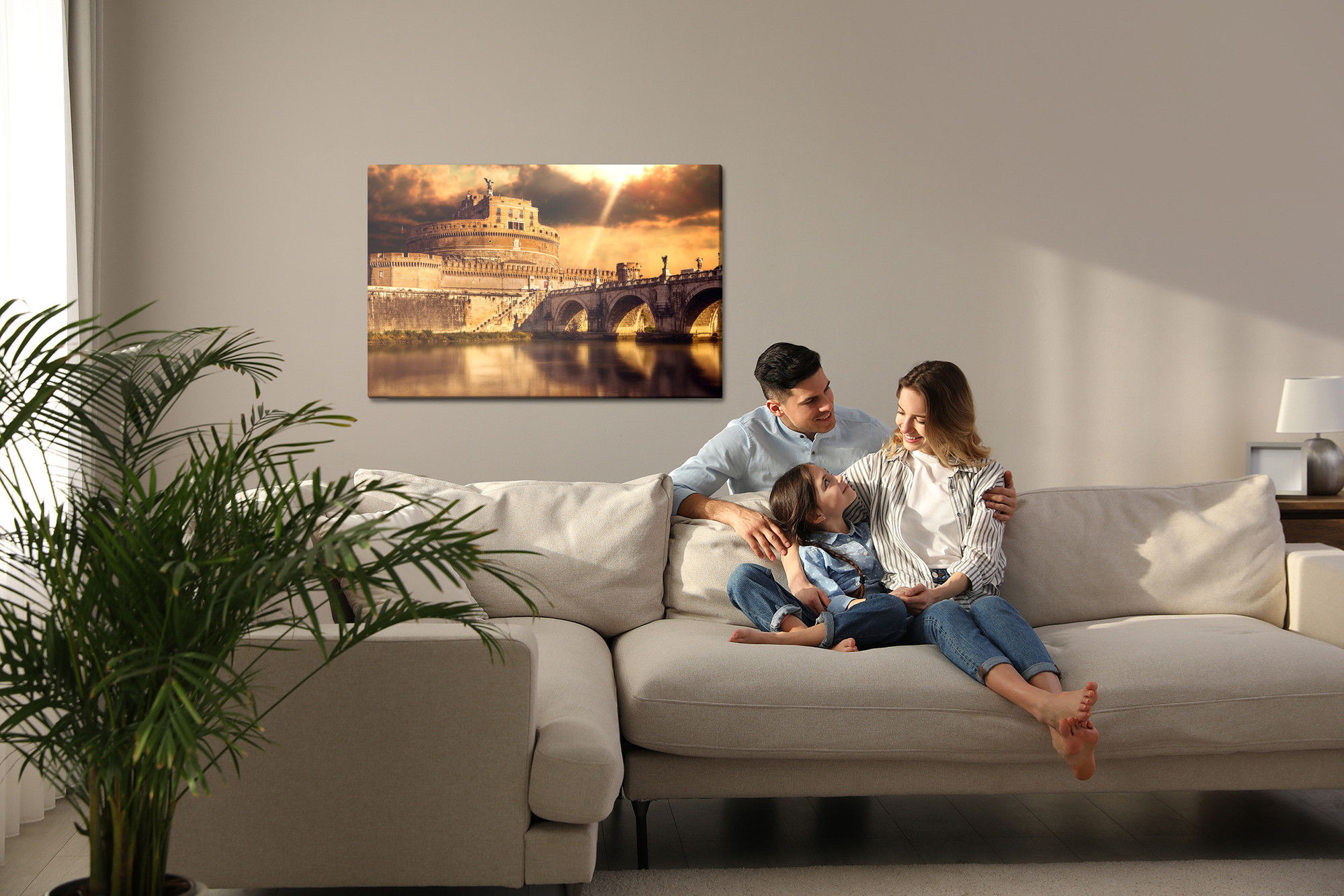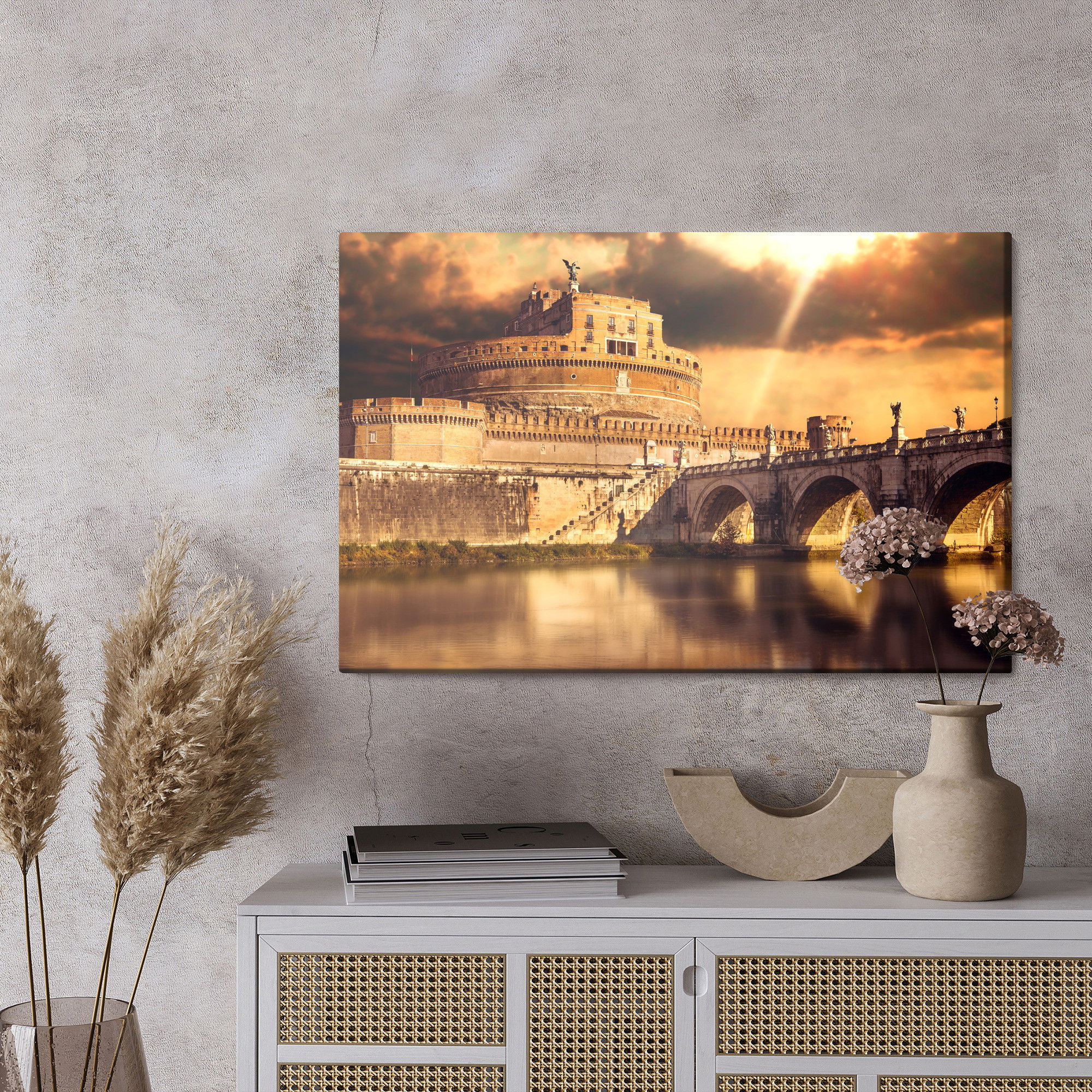 Varje tavla monteras på en massiv fururam. Format upp till 70×50 cm har en ram på 15 mm, medan format från 90×60 cm och uppåt har en ram på 20 mm. Den exakta dukspänningen gör att tavlan håller sin form över tid. Motivet View of Rome in shades trycks runt hela ramen vilket ger ett stilrent galleriuttryck där tavlan är lika vacker från sidan som framifrån. Kombinationen av rak dukspänning, rena linjer och korrekt tryck ger en professionell finish.