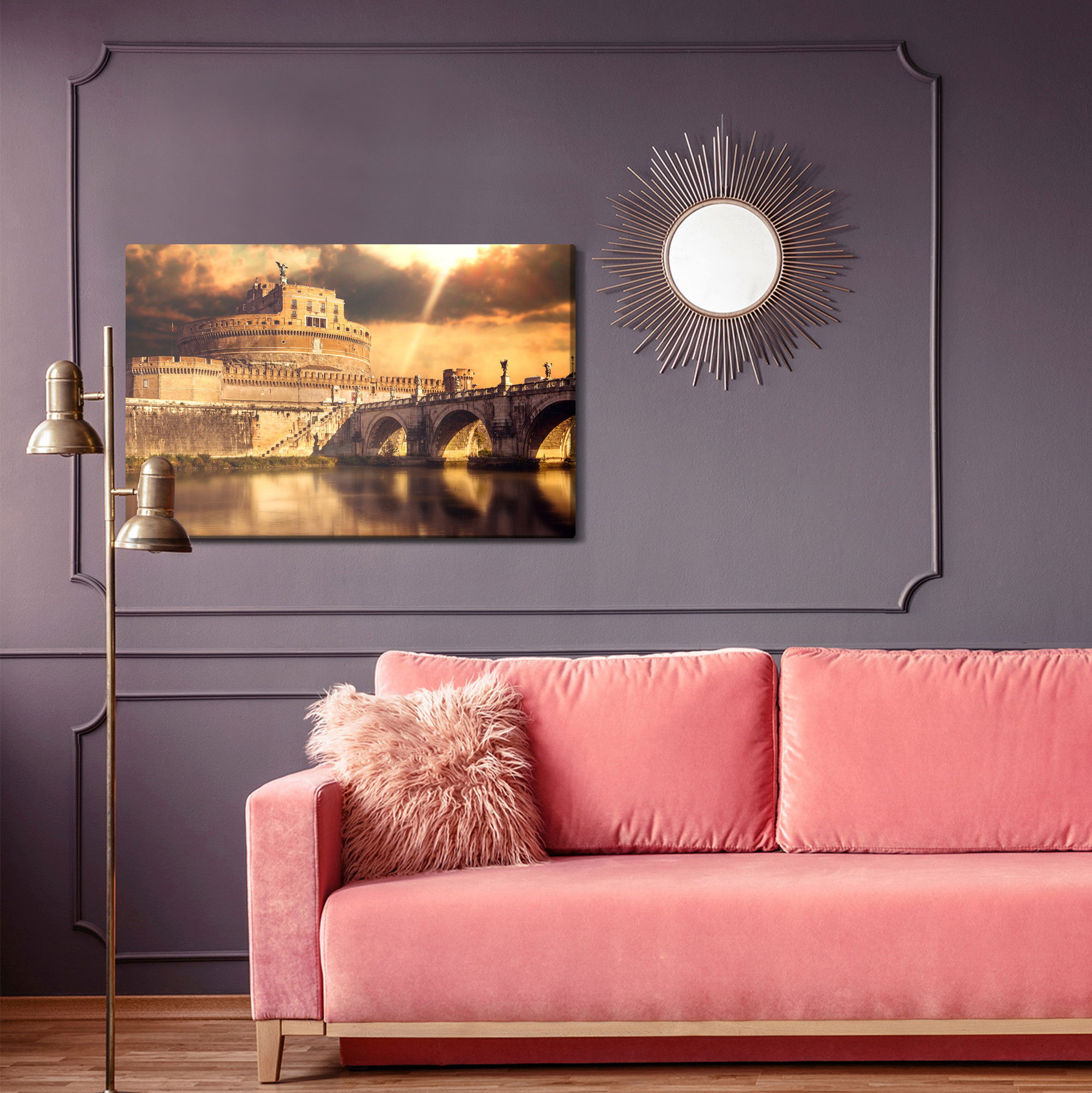 SilentDirects ljuddämpande tavla View of Rome in shades kombinerar ett högupplöst motiv med avancerad akustikteknik. Varje tavla monteras i Sverige och bygger på en stabil canvastavla med fururam, där insidan av ramen fylls med en ljudabsorberande kärna av återvunnen polyester. Konstruktionen gör tavlan till ett både estetiskt och funktionellt inslag i rummet.