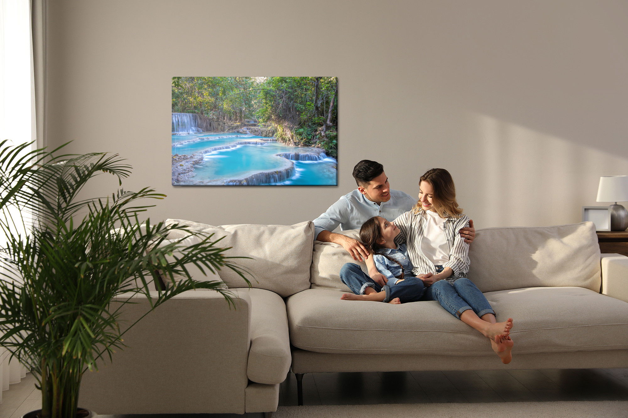 Motivet View of the kuang si återges med hög färgprecision och detaljrikedom tack vare HP Latex-teknologi. Trycket sker med vattenbaserade, luktfria och GREENGUARD Gold-certifierade bläck som ger en upplösning på upp till 300 DPI. Färgerna är UV-beständiga och behåller sin styrka även i ljusa rum, vilket gör tavlan lämplig för både hem- och offentliga miljöer.