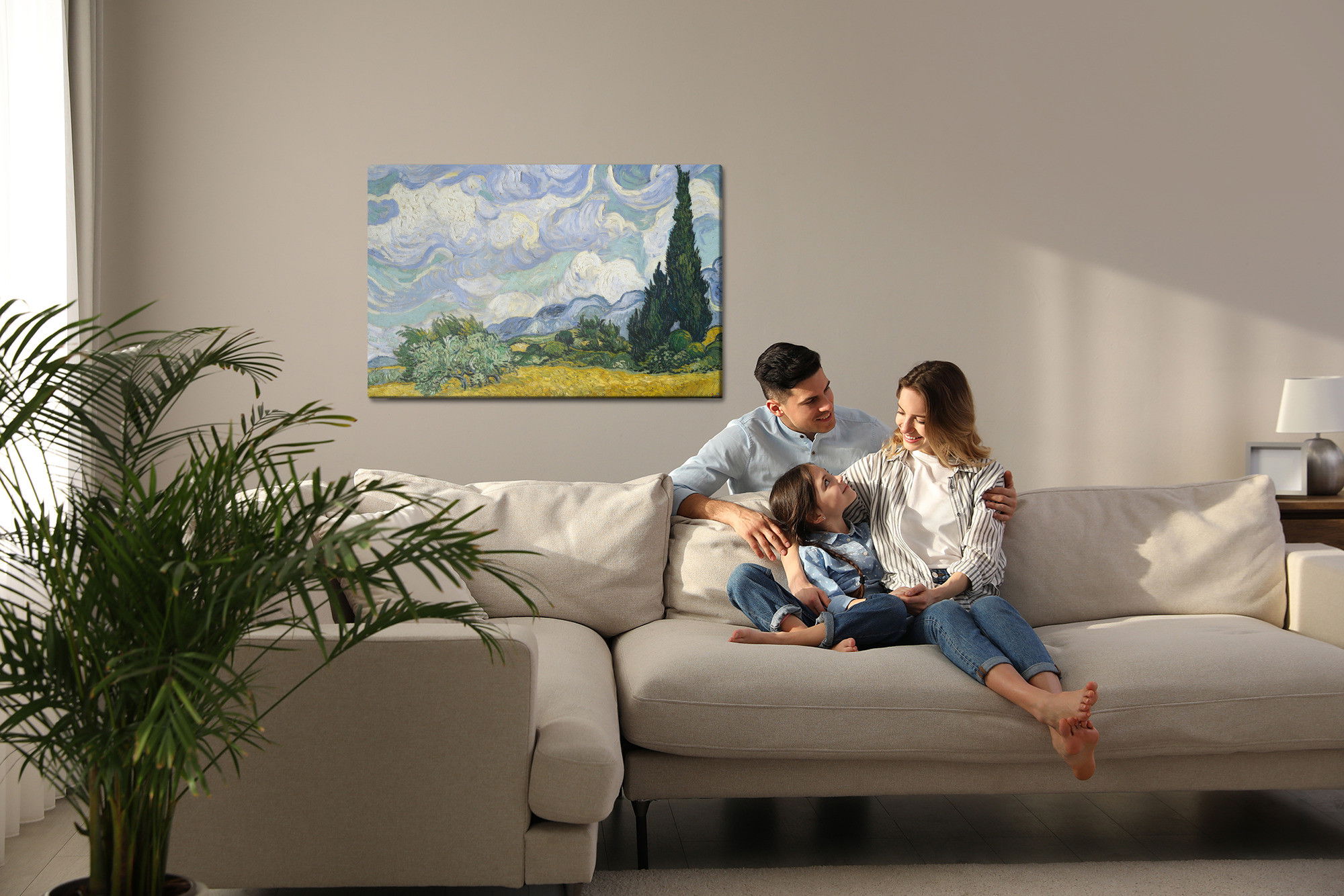 Varje tavla monteras på en massiv fururam. Format upp till 70×50 cm har en ram på 15 mm, medan format från 90×60 cm och uppåt har en ram på 20 mm. Den exakta dukspänningen gör att tavlan håller sin form över tid. Motivet Vincent van gogh "wheat field trycks runt hela ramen vilket ger ett stilrent galleriuttryck där tavlan är lika vacker från sidan som framifrån. Kombinationen av rak dukspänning, rena linjer och korrekt tryck ger en professionell finish.