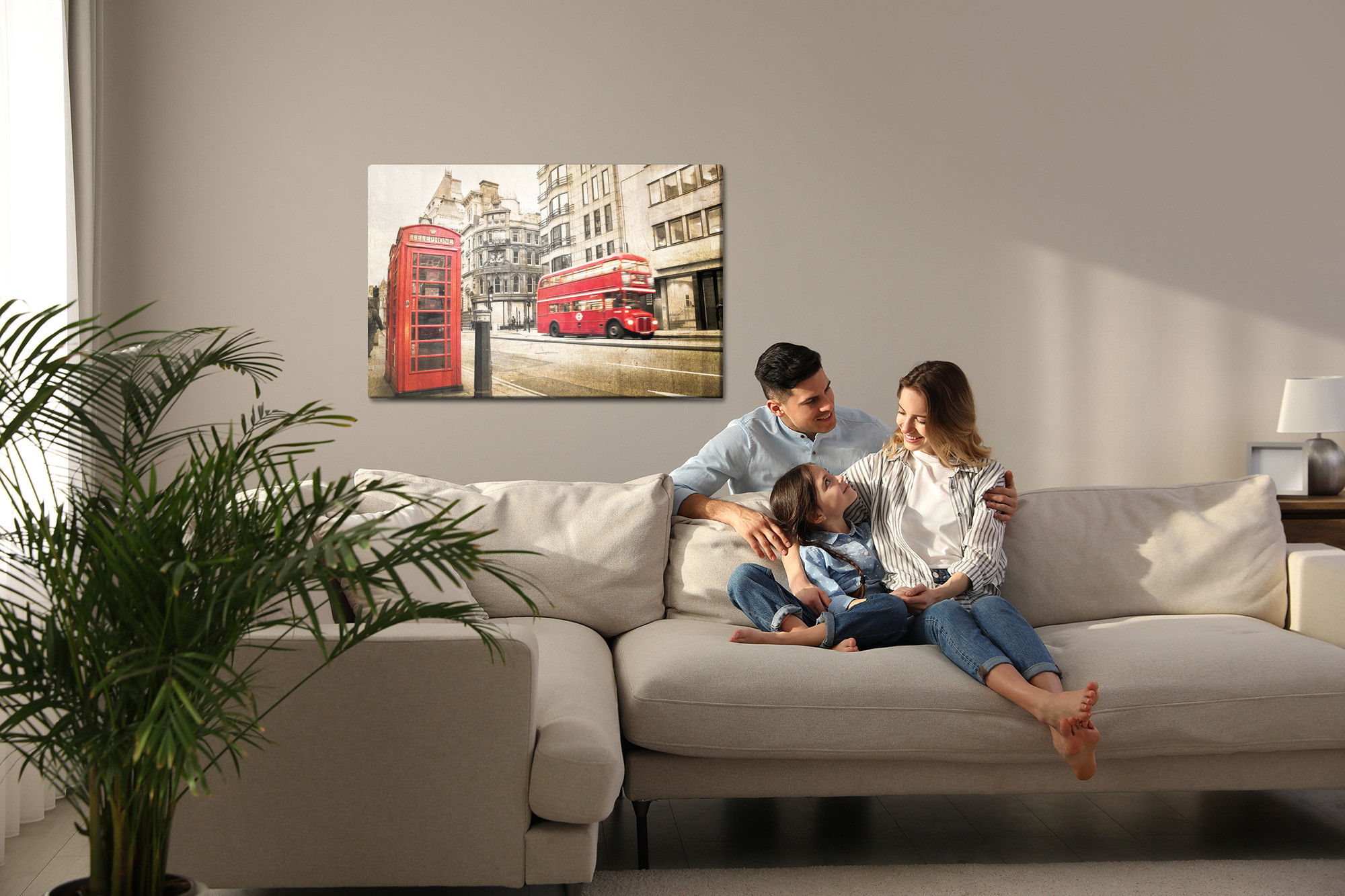 Varje tavla monteras på en massiv fururam. Format upp till 70×50 cm har en ram på 15 mm, medan format från 90×60 cm och uppåt har en ram på 20 mm. Den exakta dukspänningen gör att tavlan håller sin form över tid. Motivet Vintage London street trycks runt hela ramen vilket ger ett stilrent galleriuttryck där tavlan är lika vacker från sidan som framifrån. Kombinationen av rak dukspänning, rena linjer och korrekt tryck ger en professionell finish.