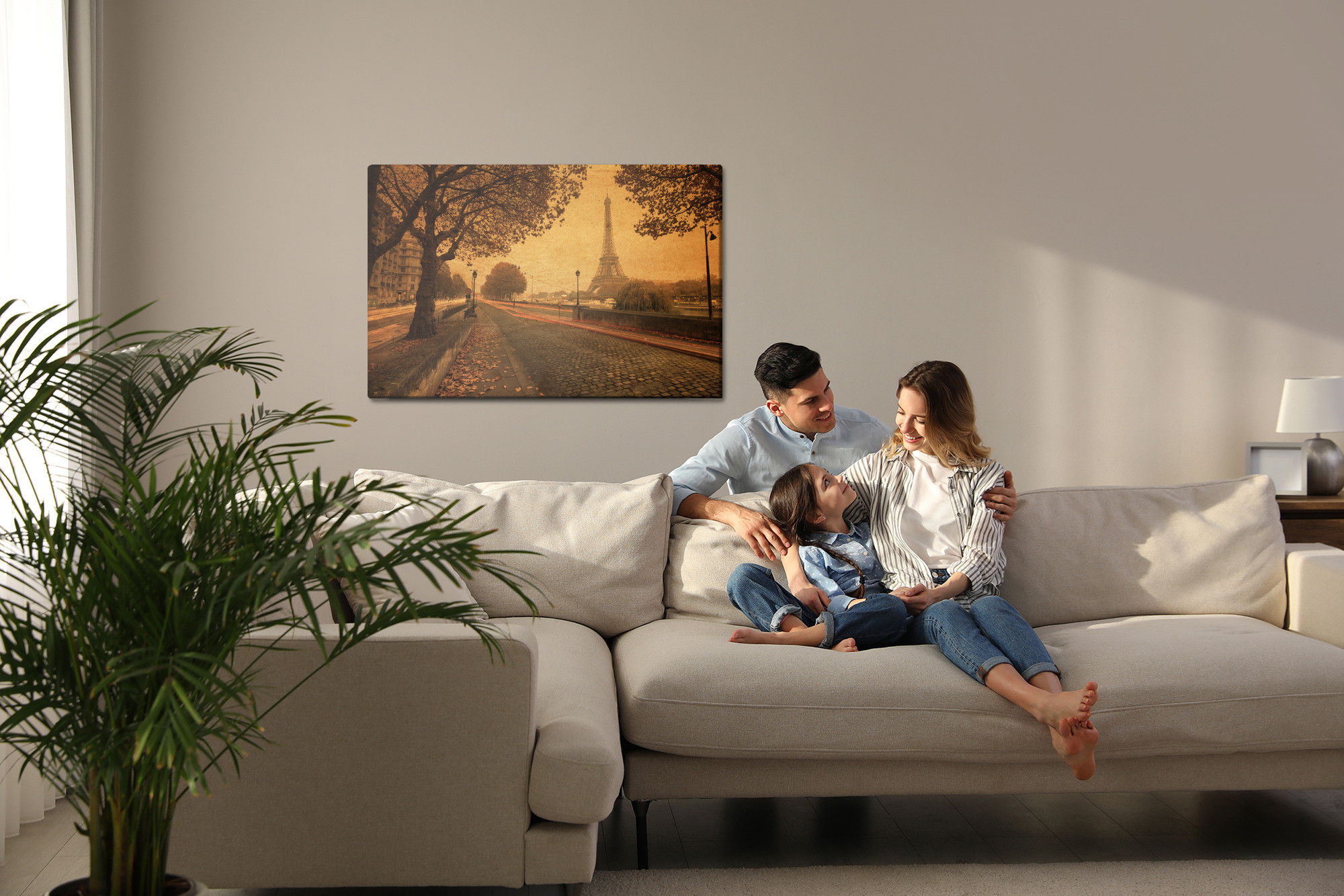 Varje tavla monteras på en massiv fururam. Format upp till 70×50 cm har en ram på 15 mm, medan format från 90×60 cm och uppåt har en ram på 20 mm. Den exakta dukspänningen gör att tavlan håller sin form över tid. Motivet Vintage streets of Paris trycks runt hela ramen vilket ger ett stilrent galleriuttryck där tavlan är lika vacker från sidan som framifrån. Kombinationen av rak dukspänning, rena linjer och korrekt tryck ger en professionell finish.