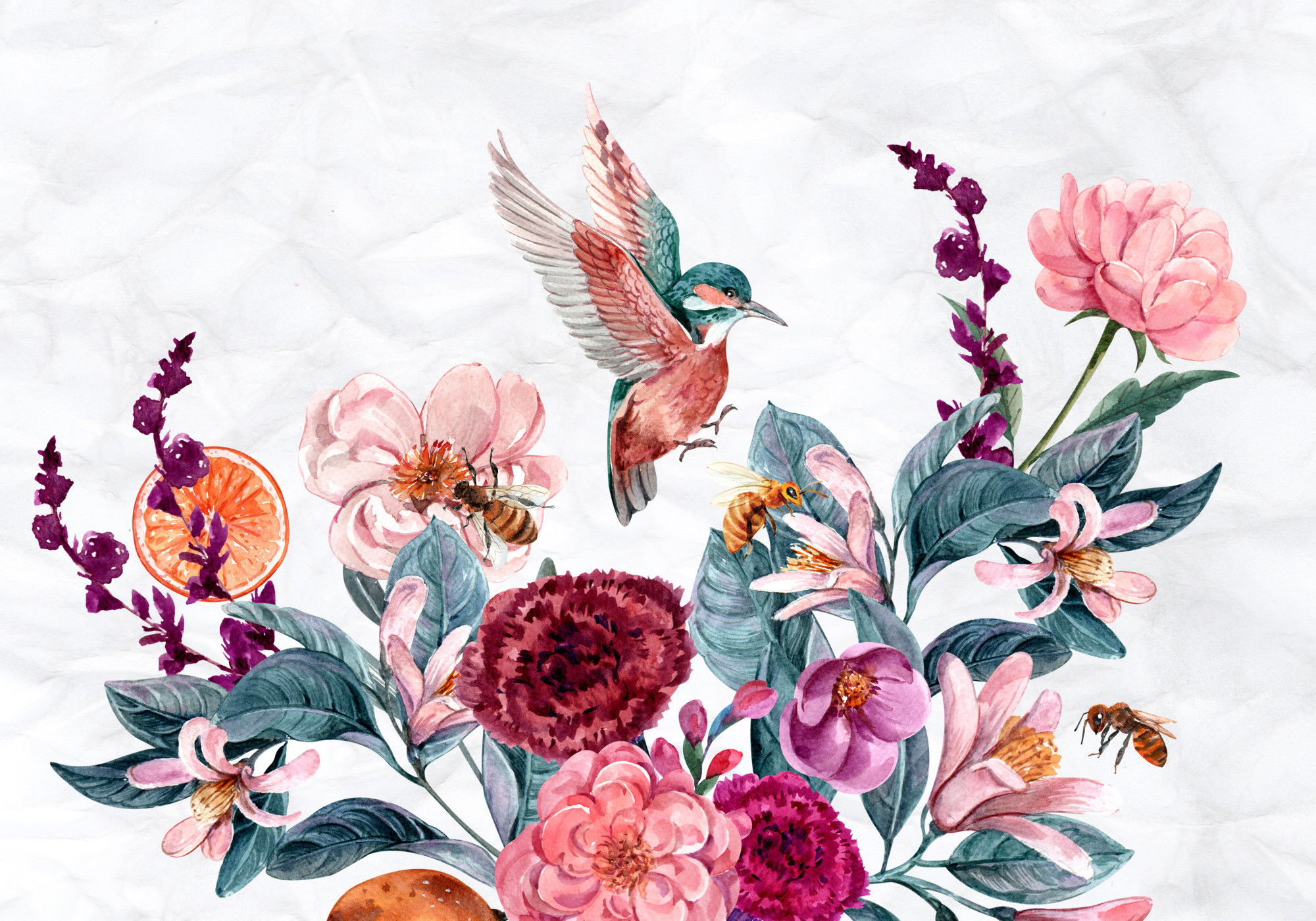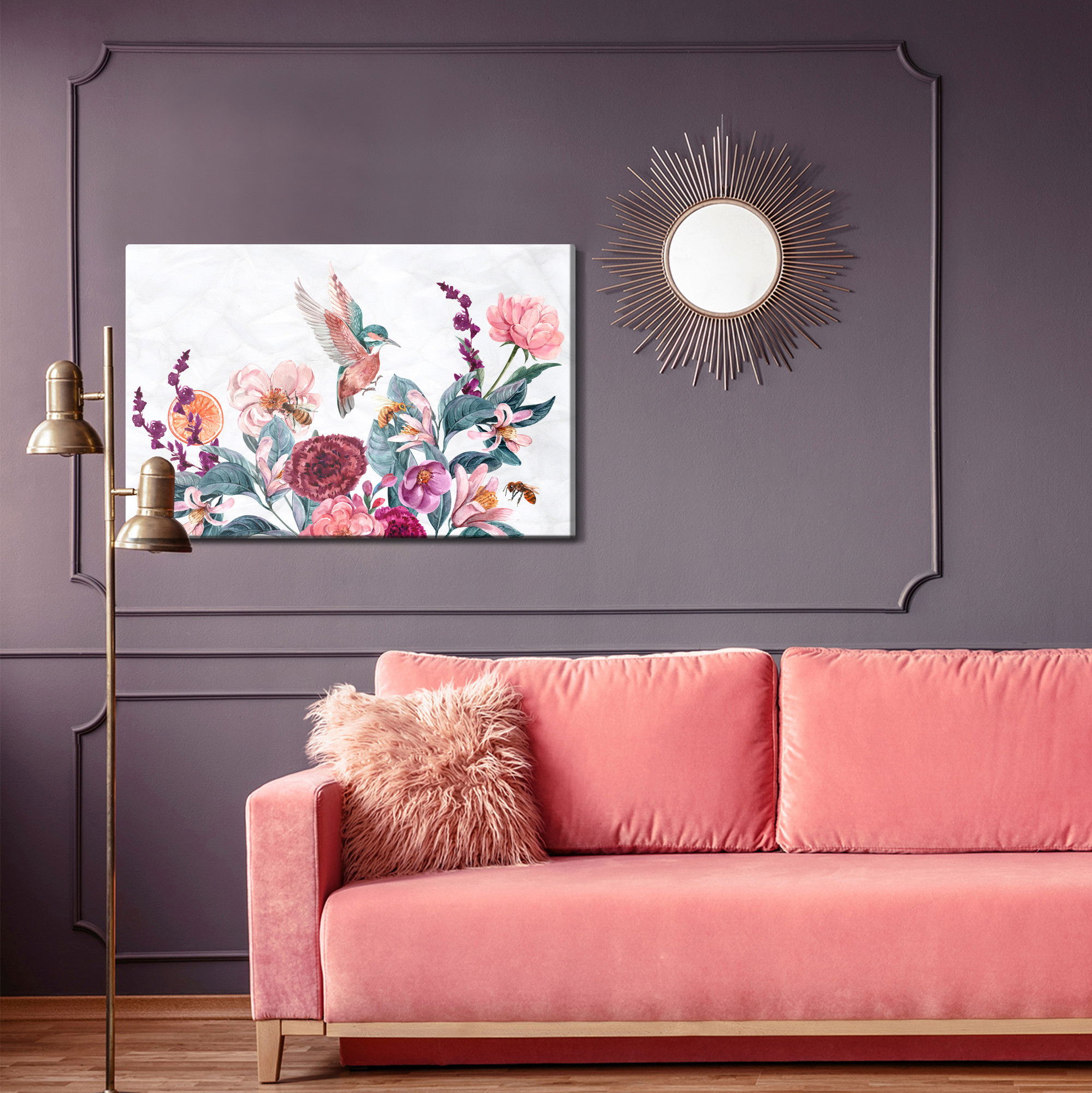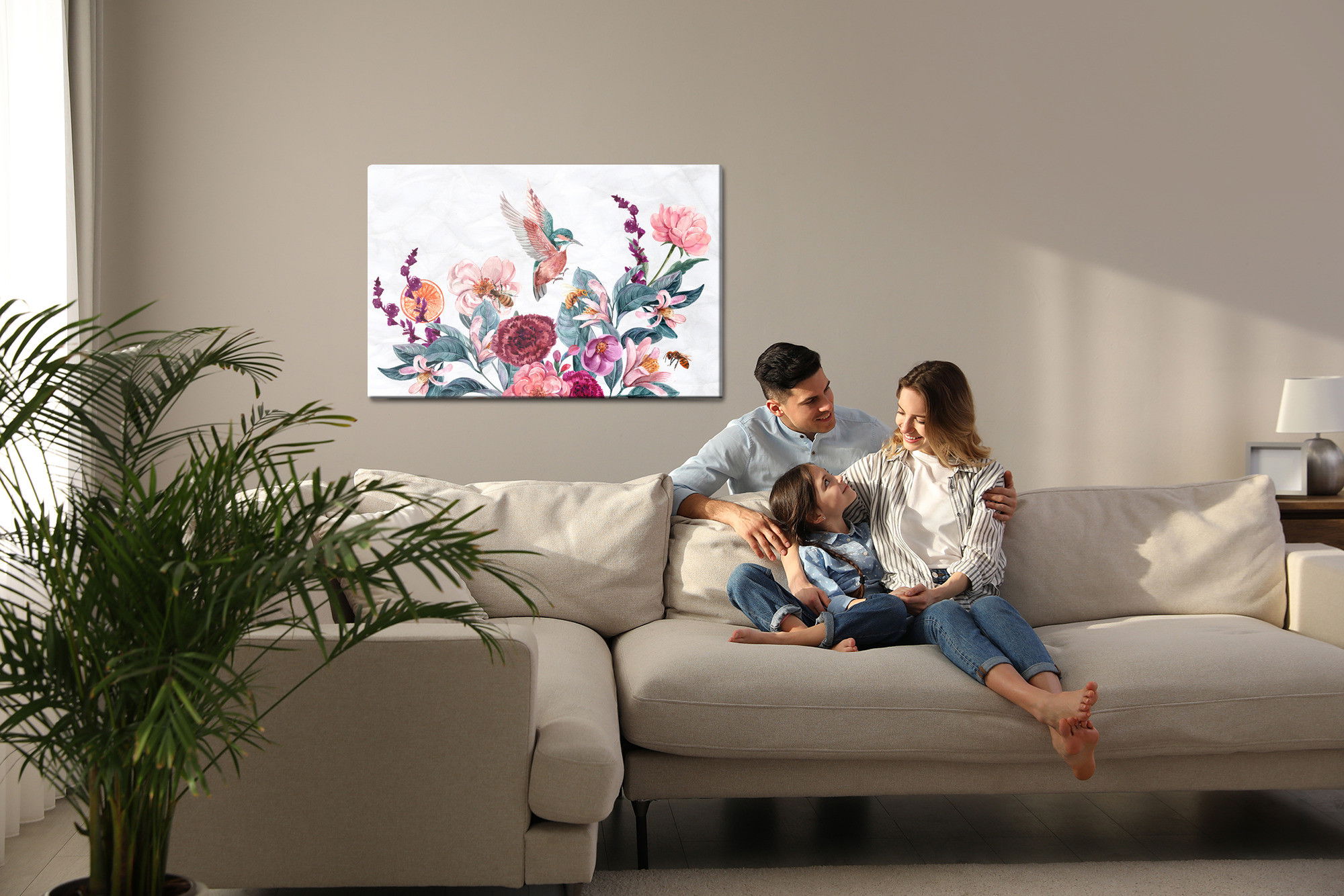 Motivet Watercolor hummingbirds återges med hög färgprecision och detaljrikedom tack vare HP Latex-teknologi. Trycket sker med vattenbaserade, luktfria och GREENGUARD Gold-certifierade bläck som ger en upplösning på upp till 300 DPI. Färgerna är UV-beständiga och behåller sin styrka även i ljusa rum, vilket gör tavlan lämplig för både hem- och offentliga miljöer.