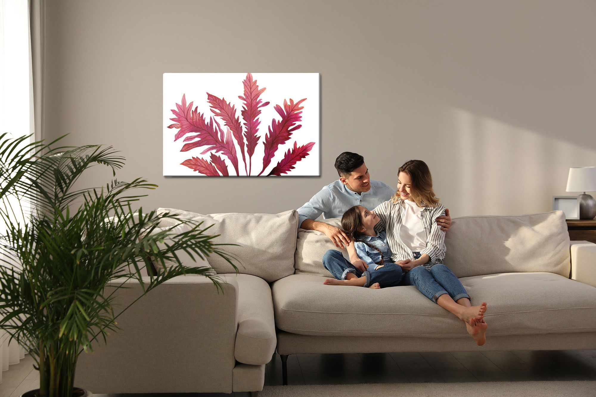 Varje tavla monteras på en massiv fururam. Format upp till 70×50 cm har en ram på 15 mm, medan format från 90×60 cm och uppåt har en ram på 20 mm. Den exakta dukspänningen gör att tavlan håller sin form över tid. Motivet Watercolor leaves trycks runt hela ramen vilket ger ett stilrent galleriuttryck där tavlan är lika vacker från sidan som framifrån. Kombinationen av rak dukspänning, rena linjer och korrekt tryck ger en professionell finish.