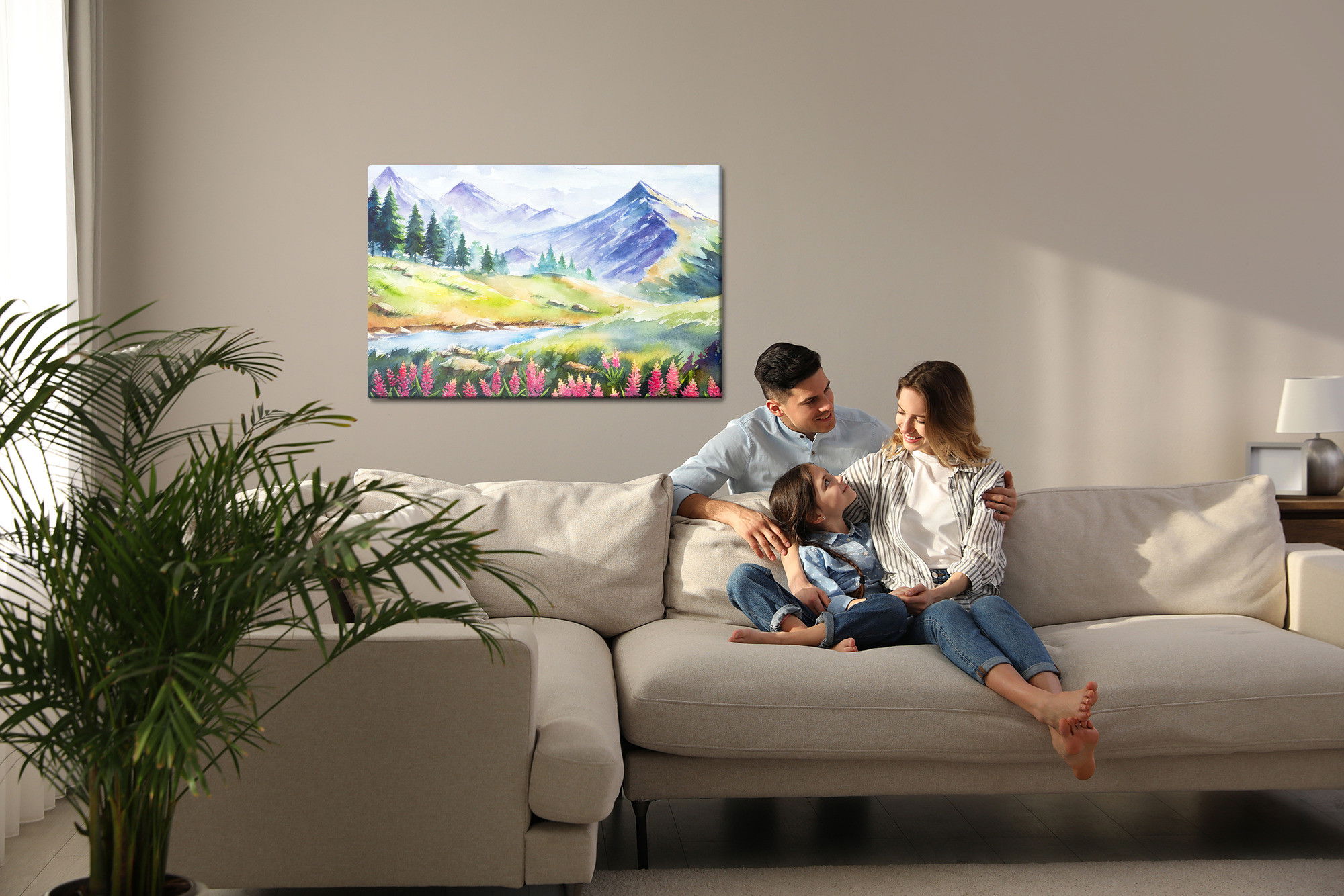 Varje tavla monteras på en massiv fururam. Format upp till 70×50 cm har en ram på 15 mm, medan format från 90×60 cm och uppåt har en ram på 20 mm. Den exakta dukspänningen gör att tavlan håller sin form över tid. Motivet Watercolor painted mountain trycks runt hela ramen vilket ger ett stilrent galleriuttryck där tavlan är lika vacker från sidan som framifrån. Kombinationen av rak dukspänning, rena linjer och korrekt tryck ger en professionell finish.