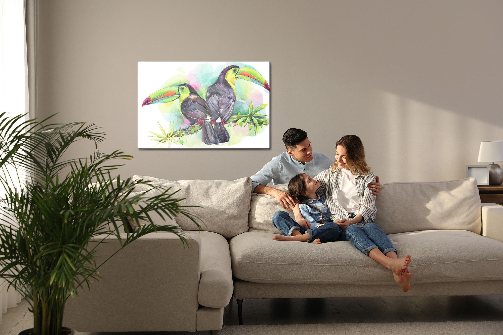Varje tavla monteras på en massiv fururam. Format upp till 70×50 cm har en ram på 15 mm, medan format från 90×60 cm och uppåt har en ram på 20 mm. Den exakta dukspänningen gör att tavlan håller sin form över tid. Motivet Watercolor parrots trycks runt hela ramen vilket ger ett stilrent galleriuttryck där tavlan är lika vacker från sidan som framifrån. Kombinationen av rak dukspänning, rena linjer och korrekt tryck ger en professionell finish.