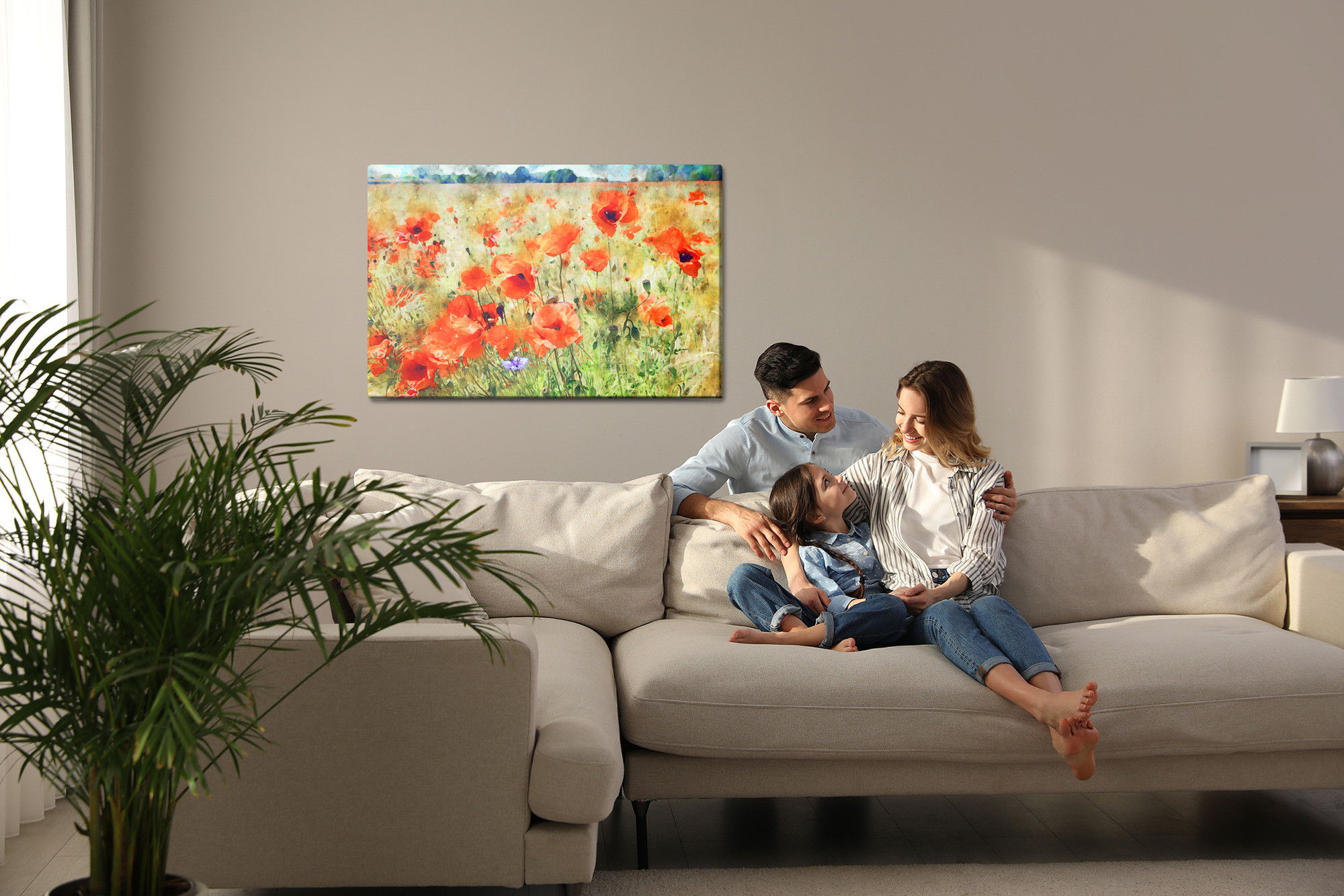 Varje tavla monteras på en massiv fururam. Format upp till 70×50 cm har en ram på 15 mm, medan format från 90×60 cm och uppåt har en ram på 20 mm. Den exakta dukspänningen gör att tavlan håller sin form över tid. Motivet Watercolor poppies trycks runt hela ramen vilket ger ett stilrent galleriuttryck där tavlan är lika vacker från sidan som framifrån. Kombinationen av rak dukspänning, rena linjer och korrekt tryck ger en professionell finish.