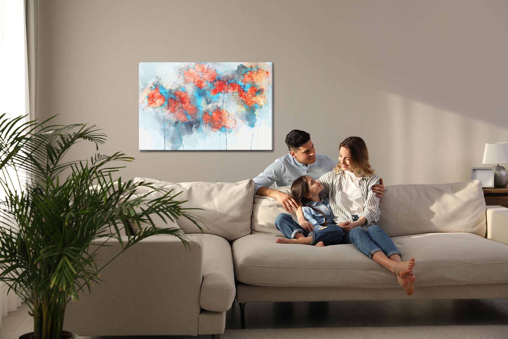 Varje tavla monteras på en massiv fururam. Format upp till 70×50 cm har en ram på 15 mm, medan format från 90×60 cm och uppåt har en ram på 20 mm. Den exakta dukspänningen gör att tavlan håller sin form över tid. Motivet Watercolor poppies trycks runt hela ramen vilket ger ett stilrent galleriuttryck där tavlan är lika vacker från sidan som framifrån. Kombinationen av rak dukspänning, rena linjer och korrekt tryck ger en professionell finish.