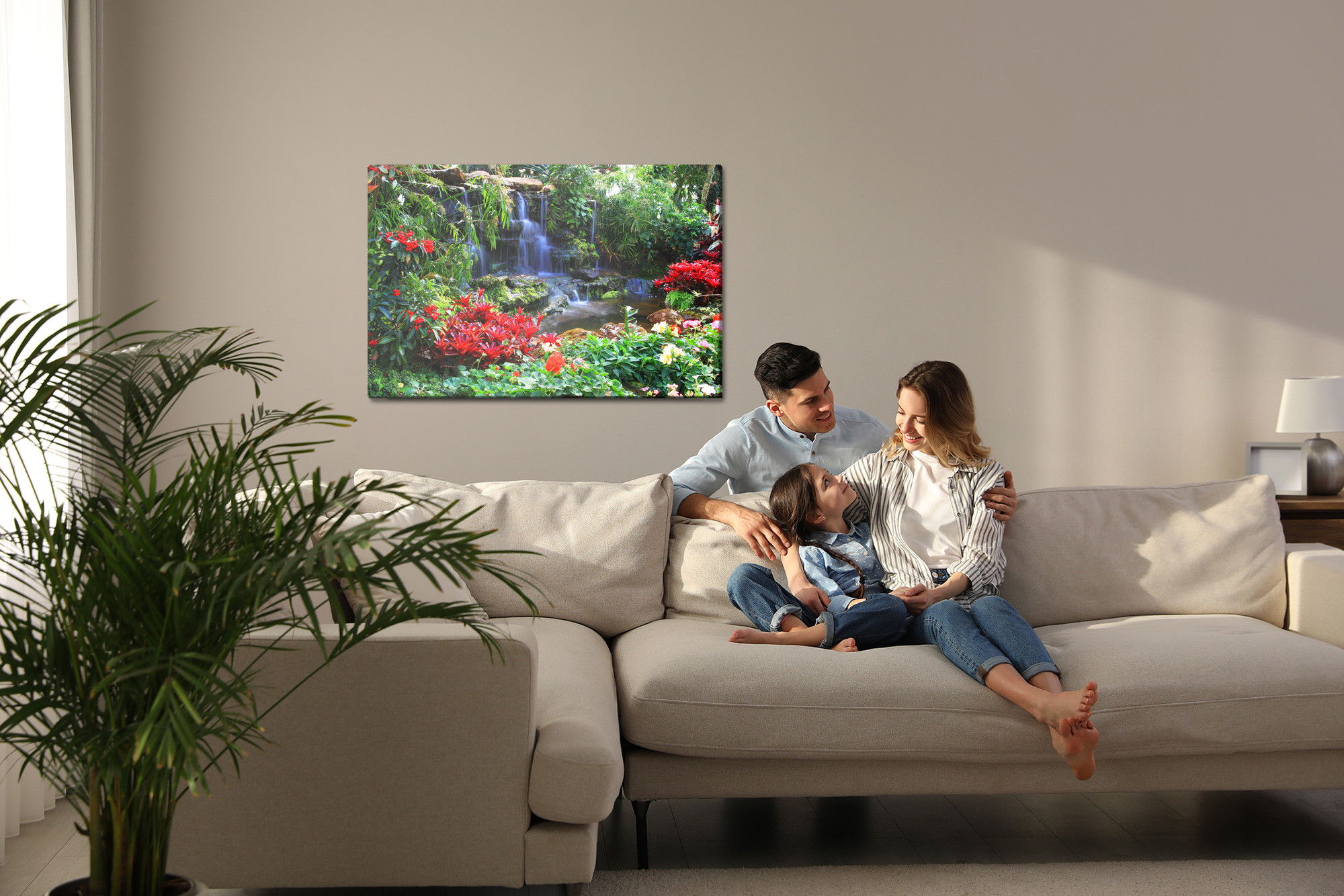 Varje tavla monteras på en massiv fururam. Format upp till 70×50 cm har en ram på 15 mm, medan format från 90×60 cm och uppåt har en ram på 20 mm. Den exakta dukspänningen gör att tavlan håller sin form över tid. Motivet Waterfall in a tropical trycks runt hela ramen vilket ger ett stilrent galleriuttryck där tavlan är lika vacker från sidan som framifrån. Kombinationen av rak dukspänning, rena linjer och korrekt tryck ger en professionell finish.