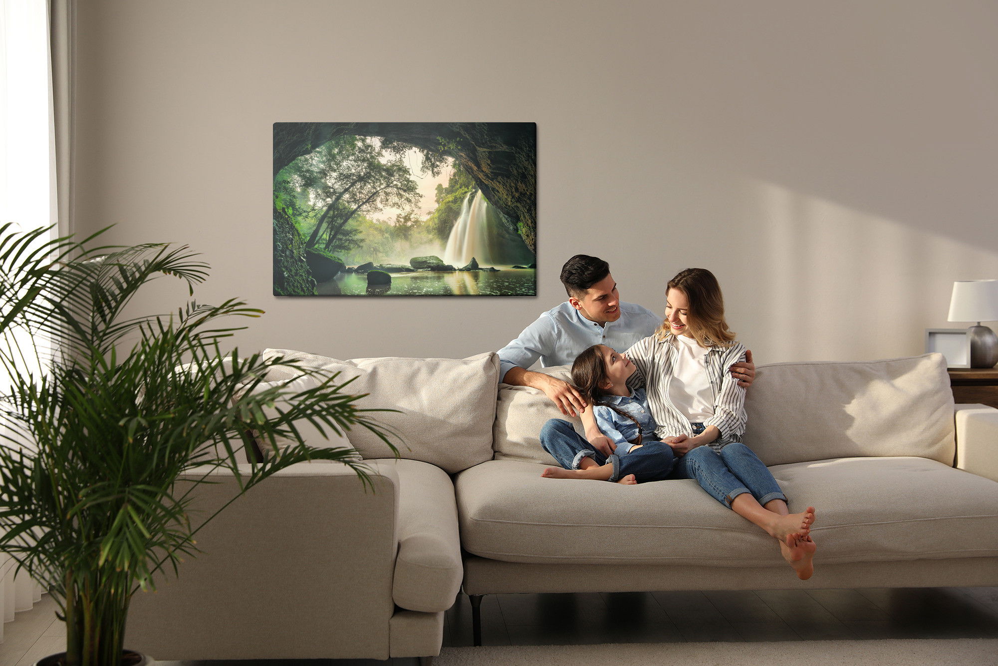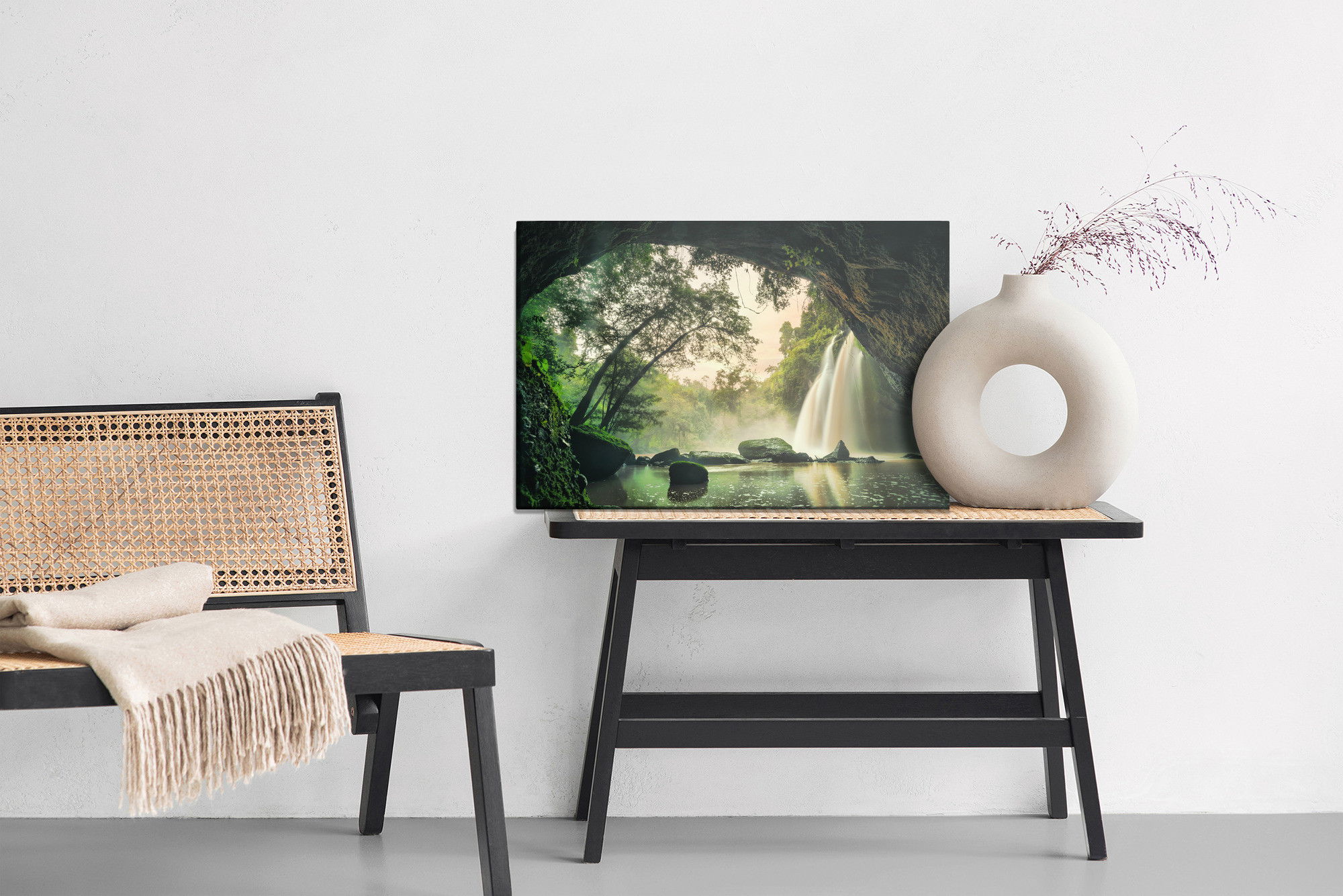 Varje tavla monteras på en massiv fururam. Format upp till 70×50 cm har en ram på 15 mm, medan format från 90×60 cm och uppåt har en ram på 20 mm. Den exakta dukspänningen gör att tavlan håller sin form över tid. Motivet Waterfall in the khao yai trycks runt hela ramen vilket ger ett stilrent galleriuttryck där tavlan är lika vacker från sidan som framifrån. Kombinationen av rak dukspänning, rena linjer och korrekt tryck ger en professionell finish.