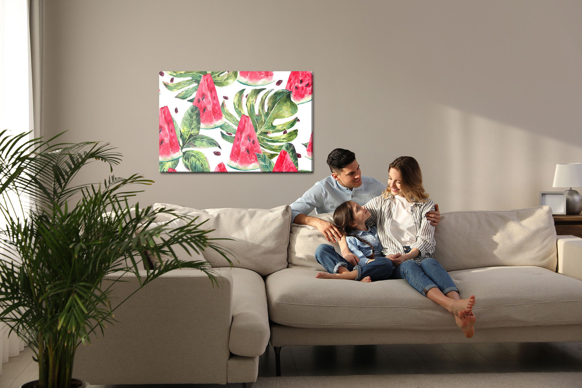 Varje tavla monteras på en massiv fururam. Format upp till 70×50 cm har en ram på 15 mm, medan format från 90×60 cm och uppåt har en ram på 20 mm. Den exakta dukspänningen gör att tavlan håller sin form över tid. Motivet Watermelon with tropical trycks runt hela ramen vilket ger ett stilrent galleriuttryck där tavlan är lika vacker från sidan som framifrån. Kombinationen av rak dukspänning, rena linjer och korrekt tryck ger en professionell finish.