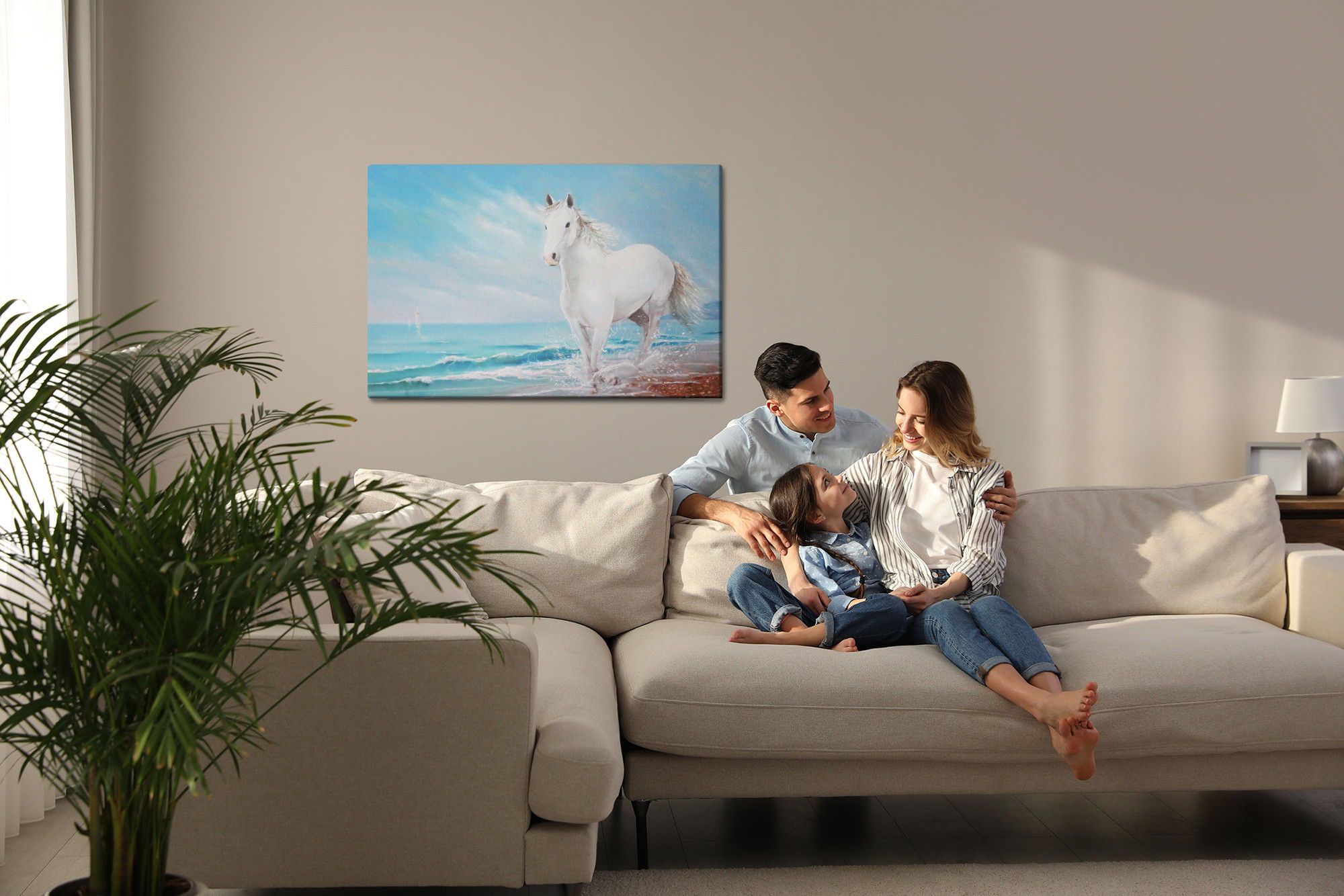 Varje tavla monteras på en massiv fururam. Format upp till 70×50 cm har en ram på 15 mm, medan format från 90×60 cm och uppåt har en ram på 20 mm. Den exakta dukspänningen gör att tavlan håller sin form över tid. Motivet White horse on the seashore trycks runt hela ramen vilket ger ett stilrent galleriuttryck där tavlan är lika vacker från sidan som framifrån. Kombinationen av rak dukspänning, rena linjer och korrekt tryck ger en professionell finish.