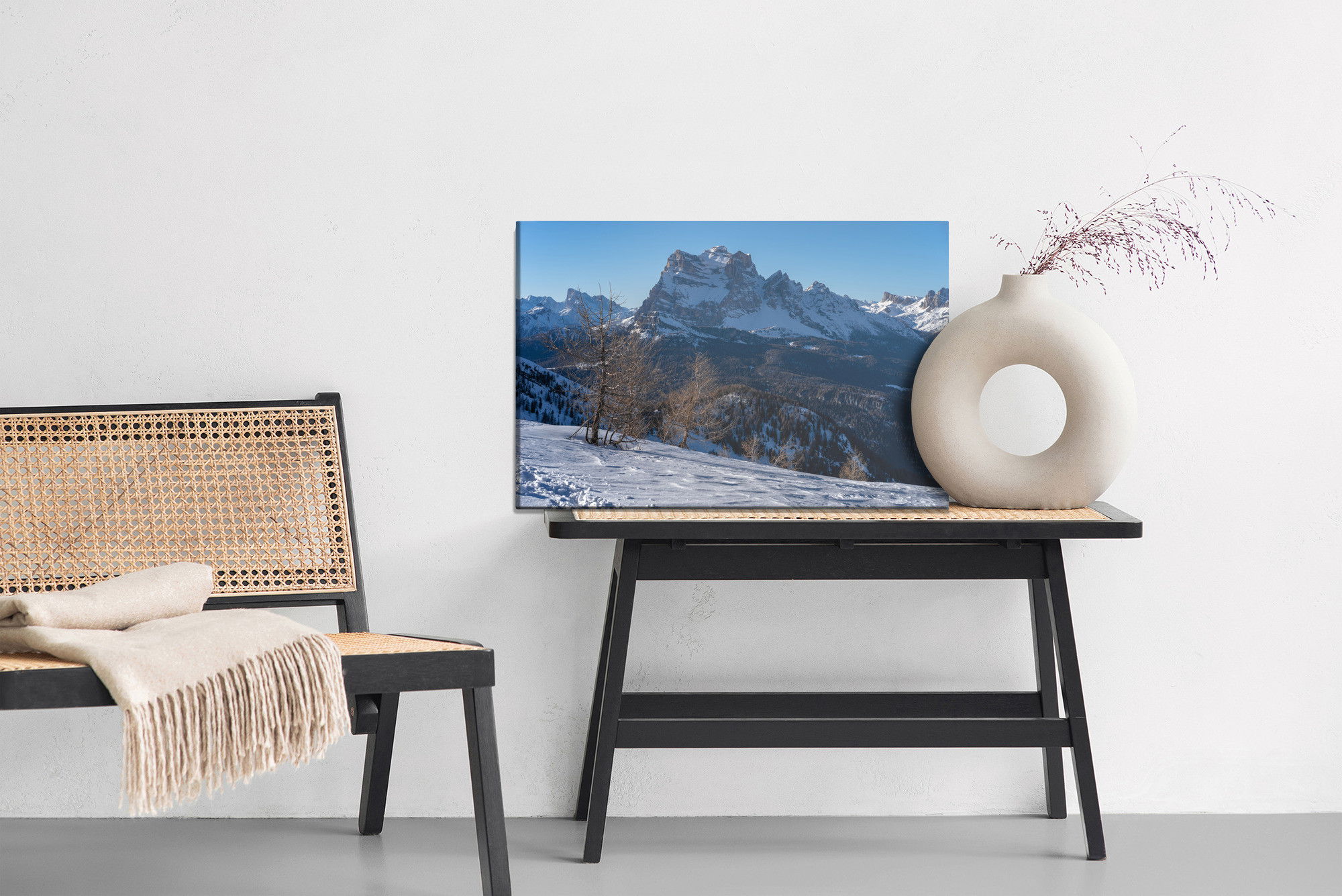 Varje tavla monteras på en massiv fururam. Format upp till 70×50 cm har en ram på 15 mm, medan format från 90×60 cm och uppåt har en ram på 20 mm. Den exakta dukspänningen gör att tavlan håller sin form över tid. Motivet Winter 3d mountain landscape trycks runt hela ramen vilket ger ett stilrent galleriuttryck där tavlan är lika vacker från sidan som framifrån. Kombinationen av rak dukspänning, rena linjer och korrekt tryck ger en professionell finish.