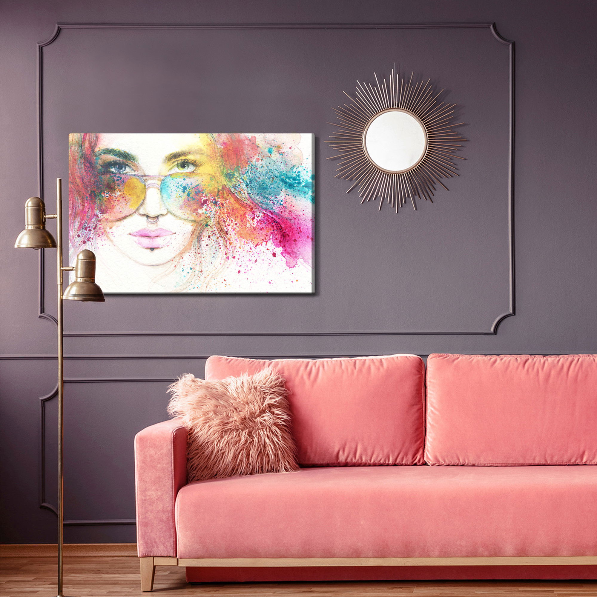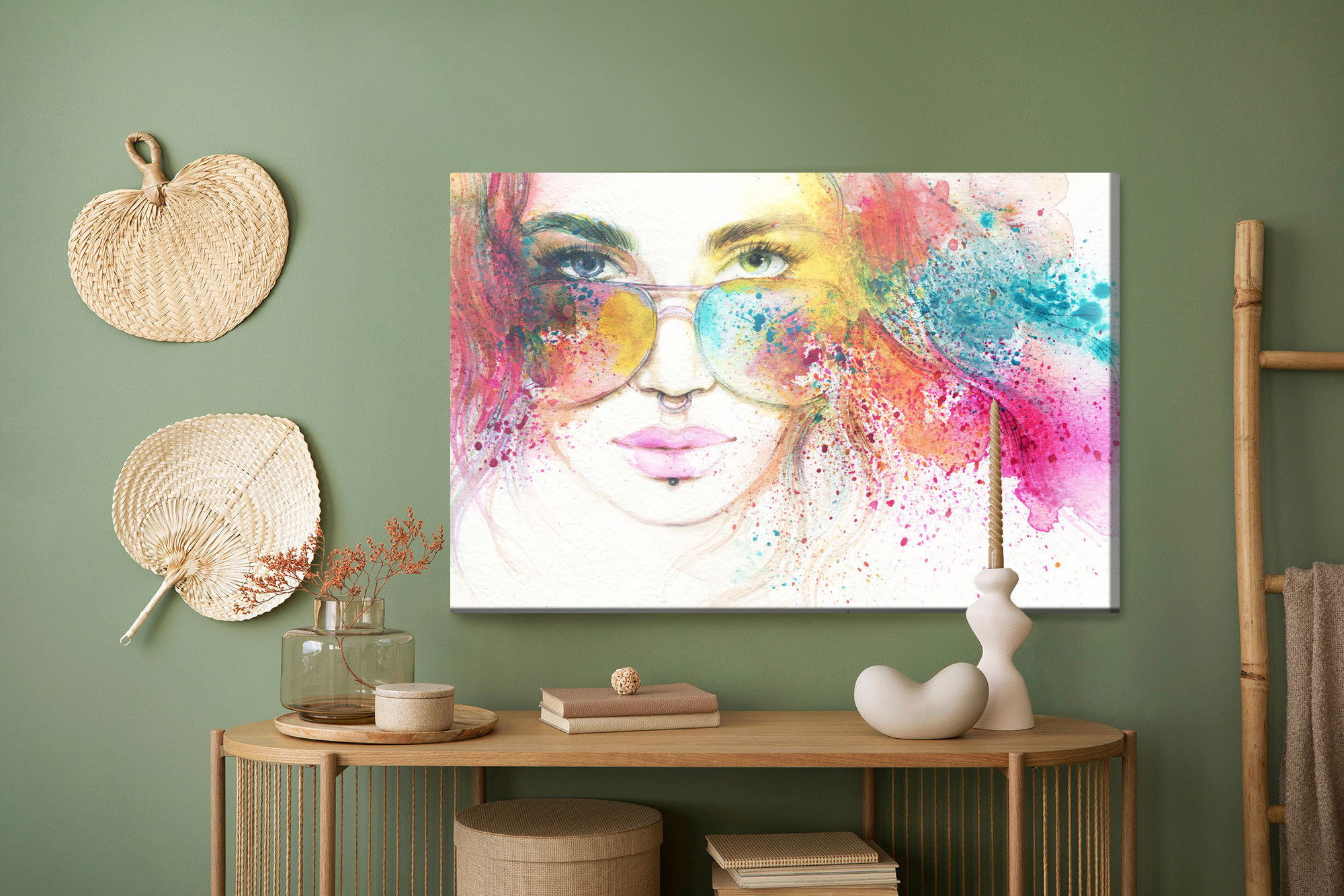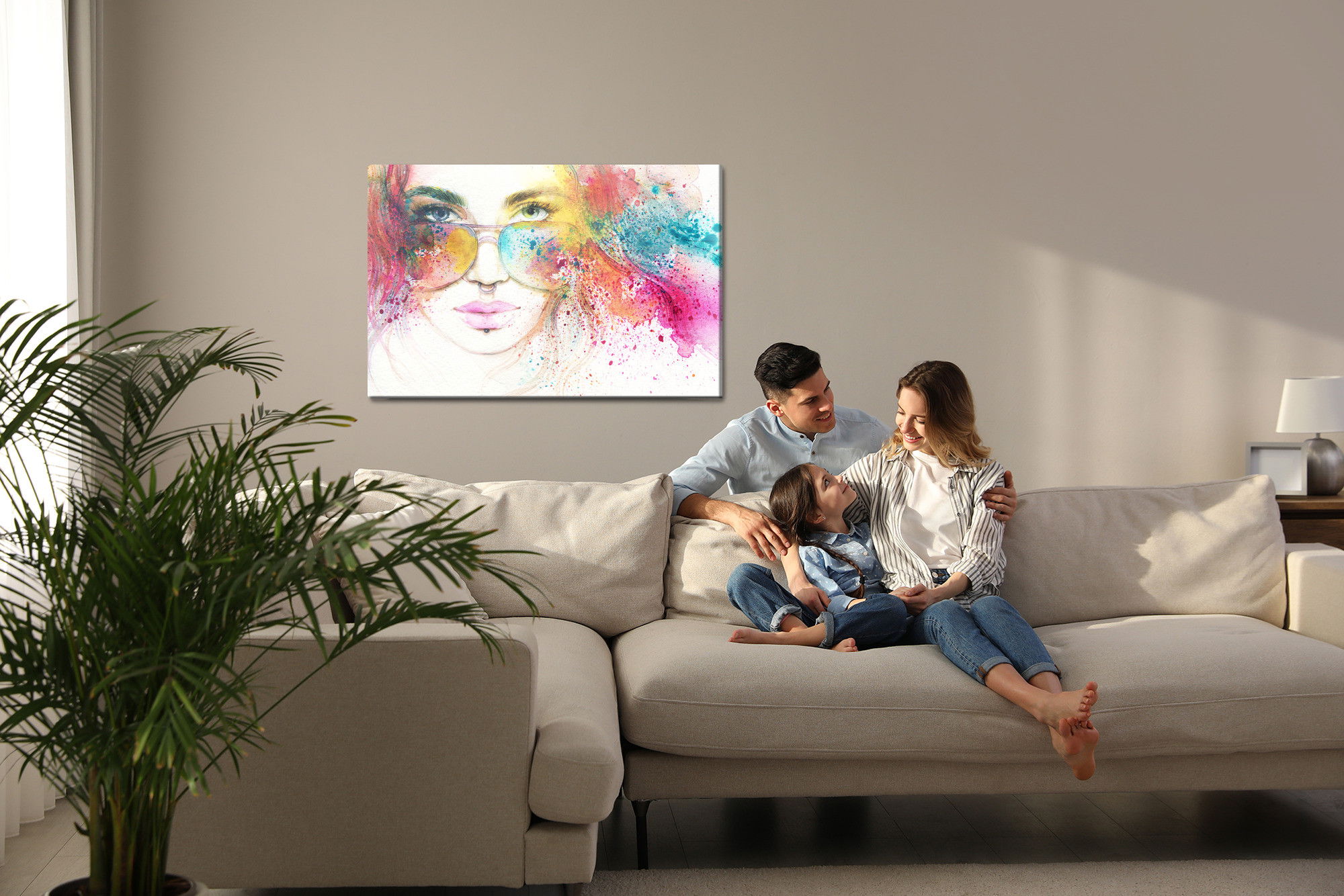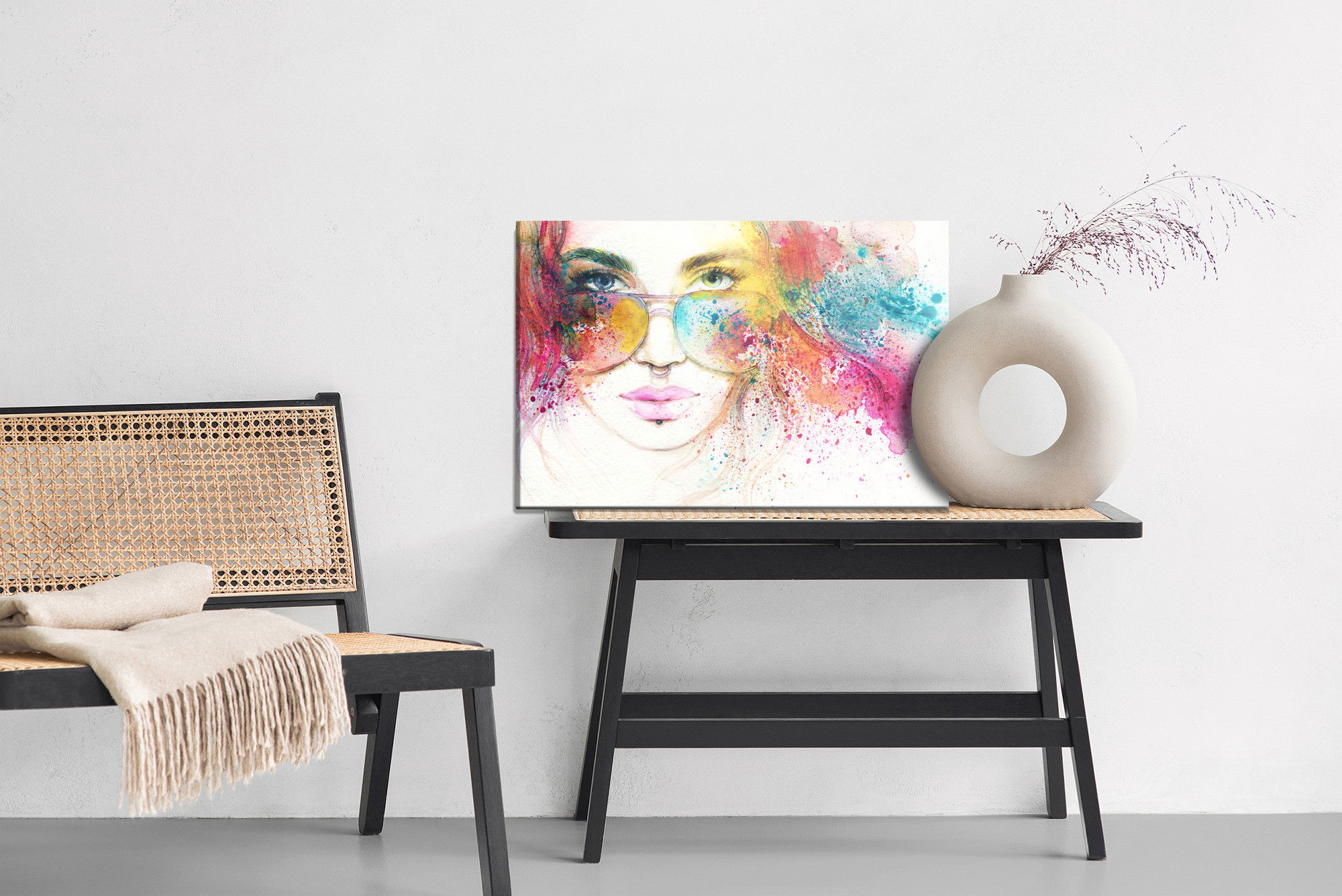 Motivet Woman in sunglasses återges med hög färgprecision och detaljrikedom tack vare HP Latex-teknologi. Trycket sker med vattenbaserade, luktfria och GREENGUARD Gold-certifierade bläck som ger en upplösning på upp till 300 DPI. Färgerna är UV-beständiga och behåller sin styrka även i ljusa rum, vilket gör tavlan lämplig för både hem- och offentliga miljöer.