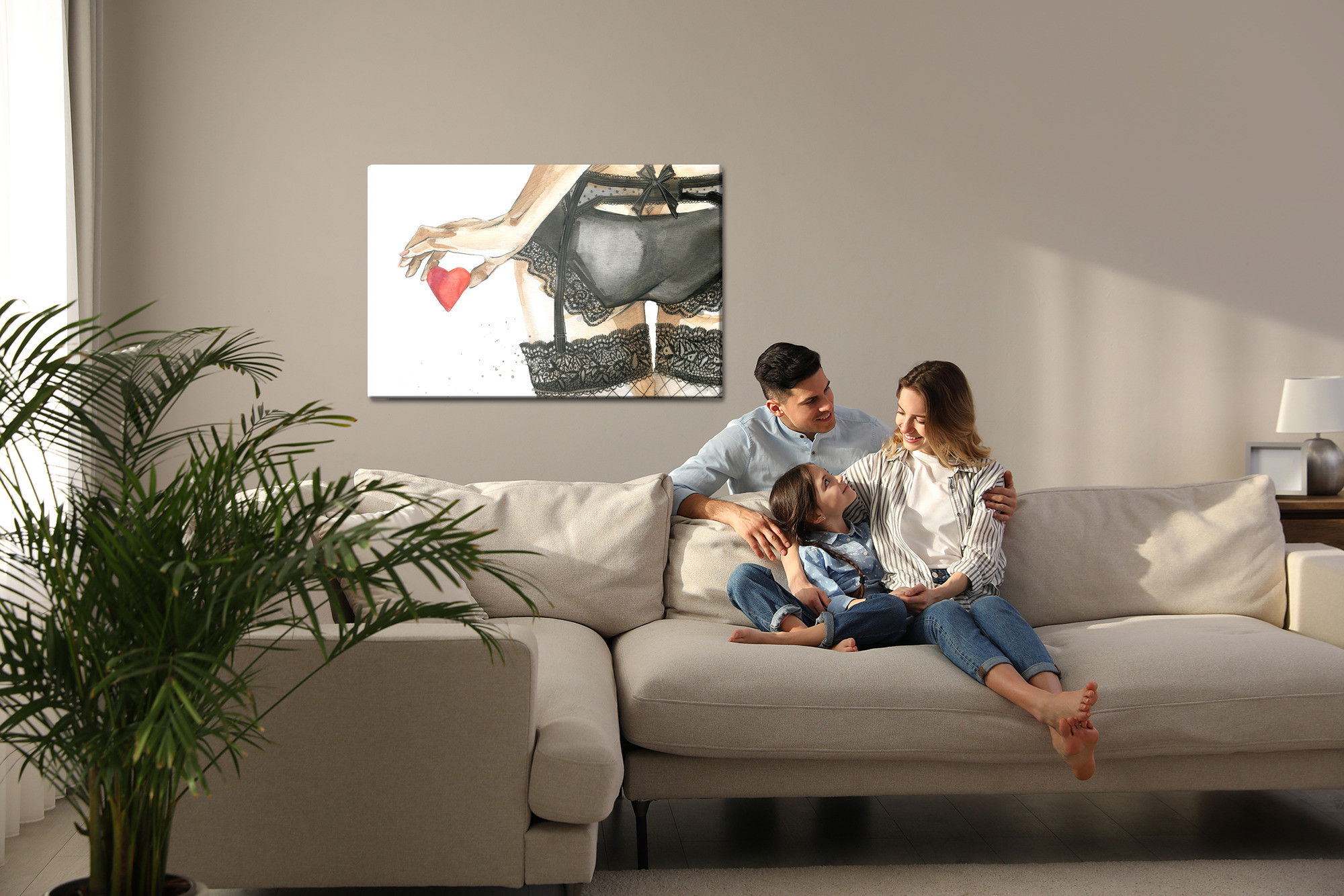 Varje tavla monteras på en massiv fururam. Format upp till 70×50 cm har en ram på 15 mm, medan format från 90×60 cm och uppåt har en ram på 20 mm. Den exakta dukspänningen gör att tavlan håller sin form över tid. Motivet Woman in underwear painted trycks runt hela ramen vilket ger ett stilrent galleriuttryck där tavlan är lika vacker från sidan som framifrån. Kombinationen av rak dukspänning, rena linjer och korrekt tryck ger en professionell finish.