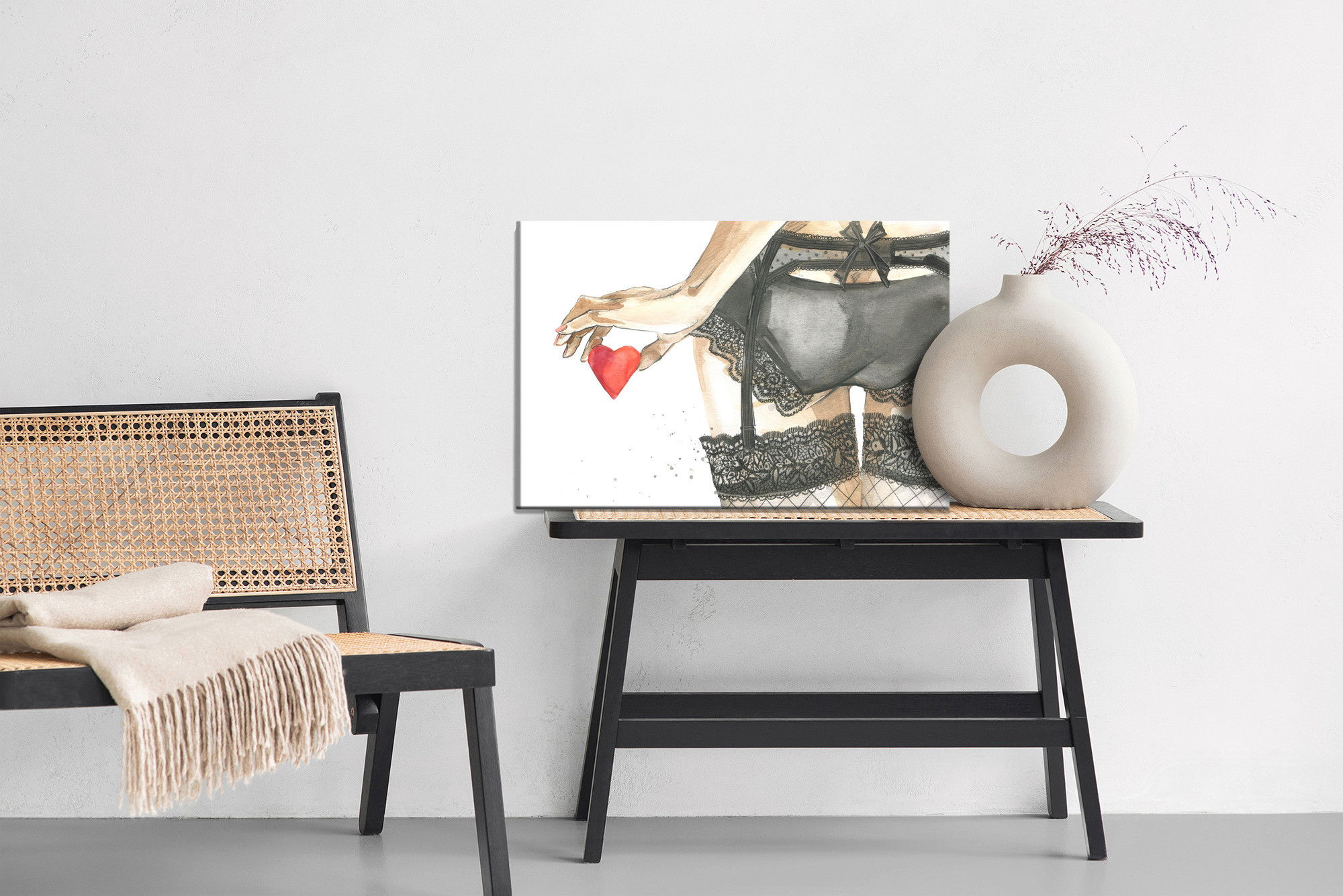 Motivet Woman in underwear painted återges med hög färgprecision och detaljrikedom tack vare HP Latex-teknologi. Trycket sker med vattenbaserade, luktfria och GREENGUARD Gold-certifierade bläck som ger en upplösning på upp till 300 DPI. Färgerna är UV-beständiga och behåller sin styrka även i ljusa rum, vilket gör tavlan lämplig för både hem- och offentliga miljöer.