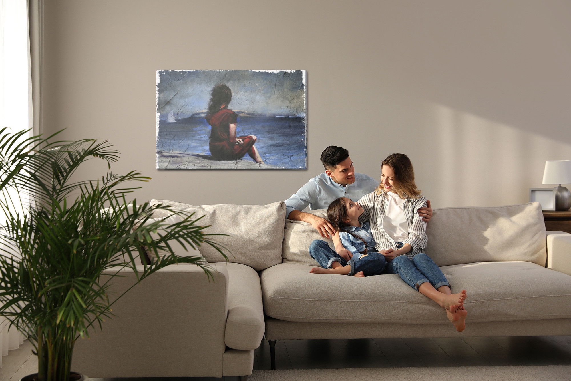 Varje tavla monteras på en massiv fururam. Format upp till 70×50 cm har en ram på 15 mm, medan format från 90×60 cm och uppåt har en ram på 20 mm. Den exakta dukspänningen gör att tavlan håller sin form över tid. Motivet Woman on the beach trycks runt hela ramen vilket ger ett stilrent galleriuttryck där tavlan är lika vacker från sidan som framifrån. Kombinationen av rak dukspänning, rena linjer och korrekt tryck ger en professionell finish.