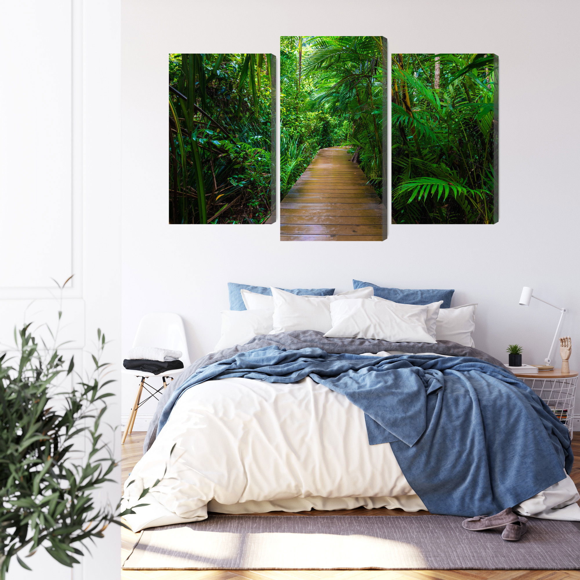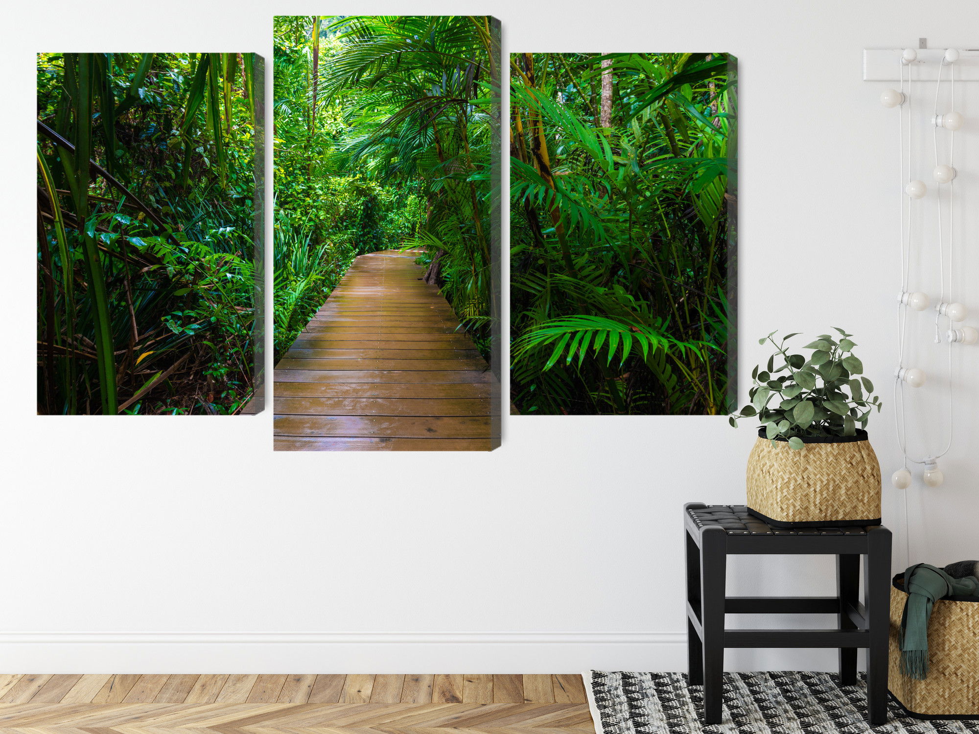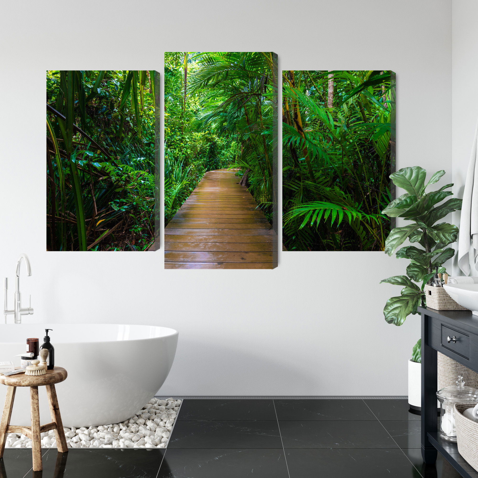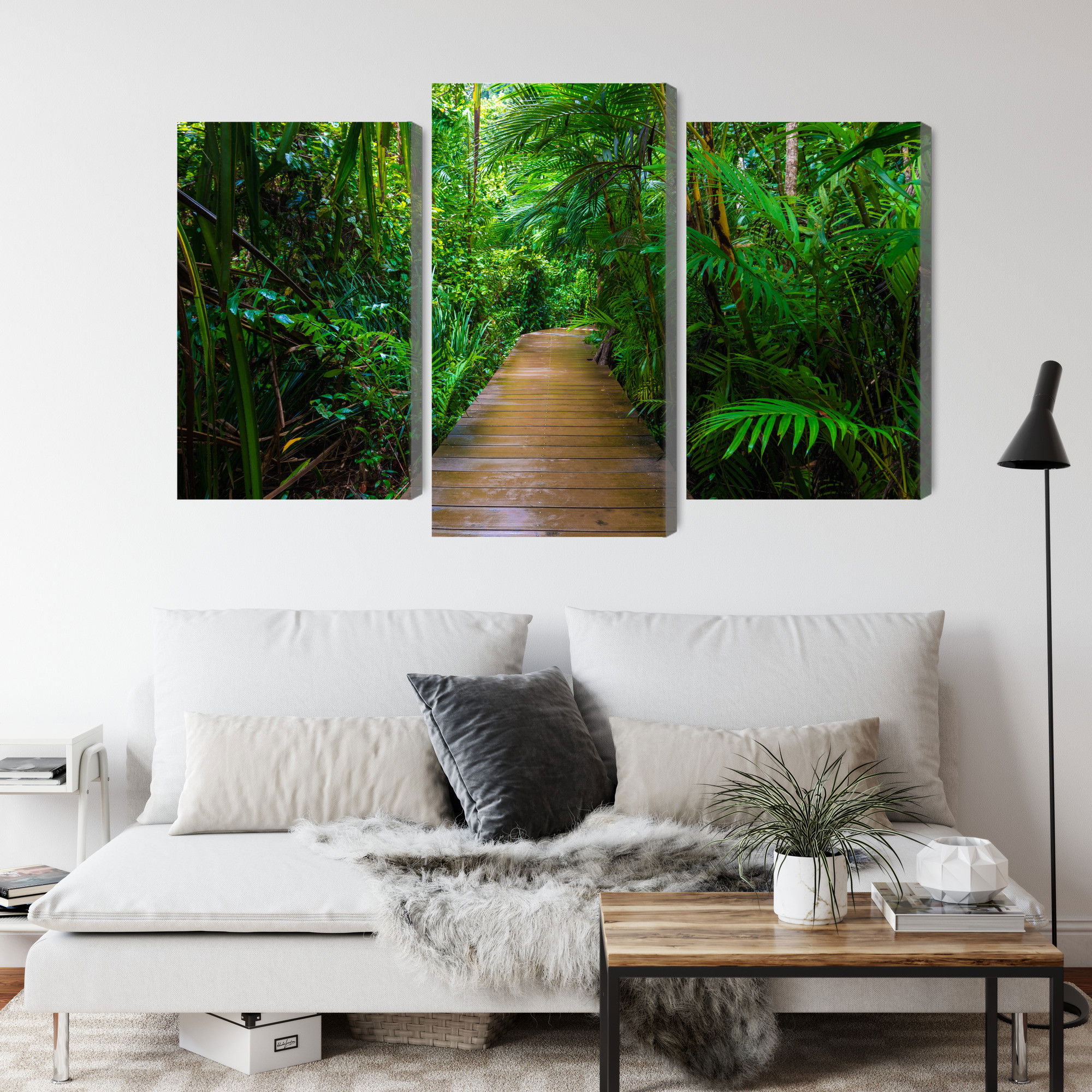 Varje tavla monteras på en massiv fururam. Format upp till 70×50 cm har en ram på 15 mm, medan format från 90×60 cm och uppåt har en ram på 20 mm. Den exakta dukspänningen gör att tavlan håller sin form över tid. Motivet Wooden bridge in a tropical trycks runt hela ramen vilket ger ett stilrent galleriuttryck där tavlan är lika vacker från sidan som framifrån. Kombinationen av rak dukspänning, rena linjer och korrekt tryck ger en professionell finish.