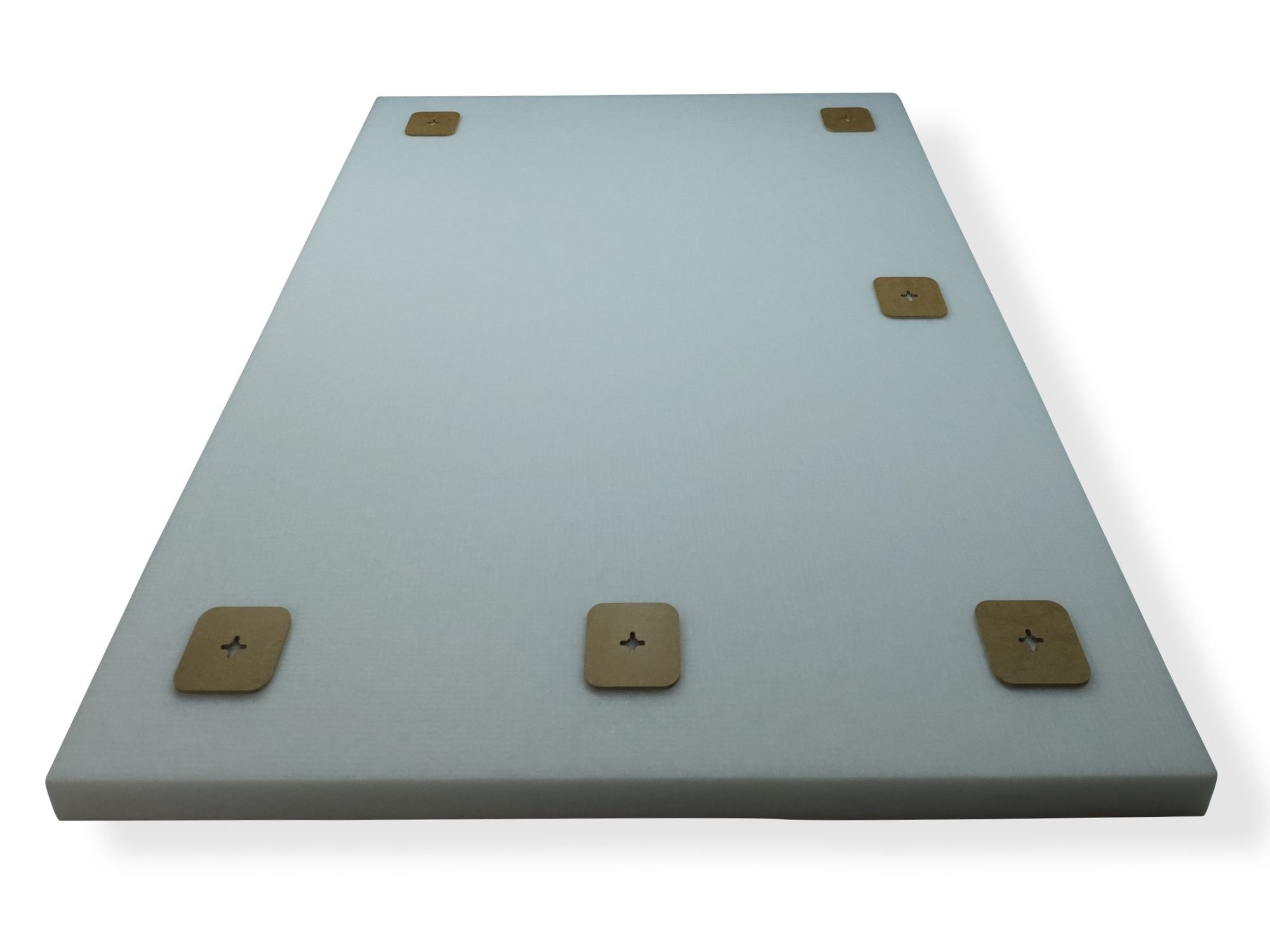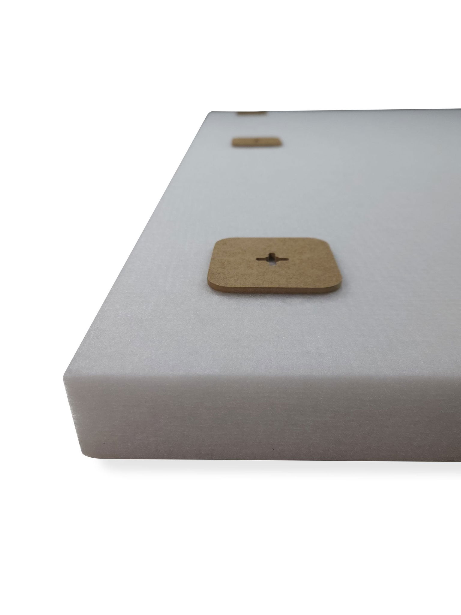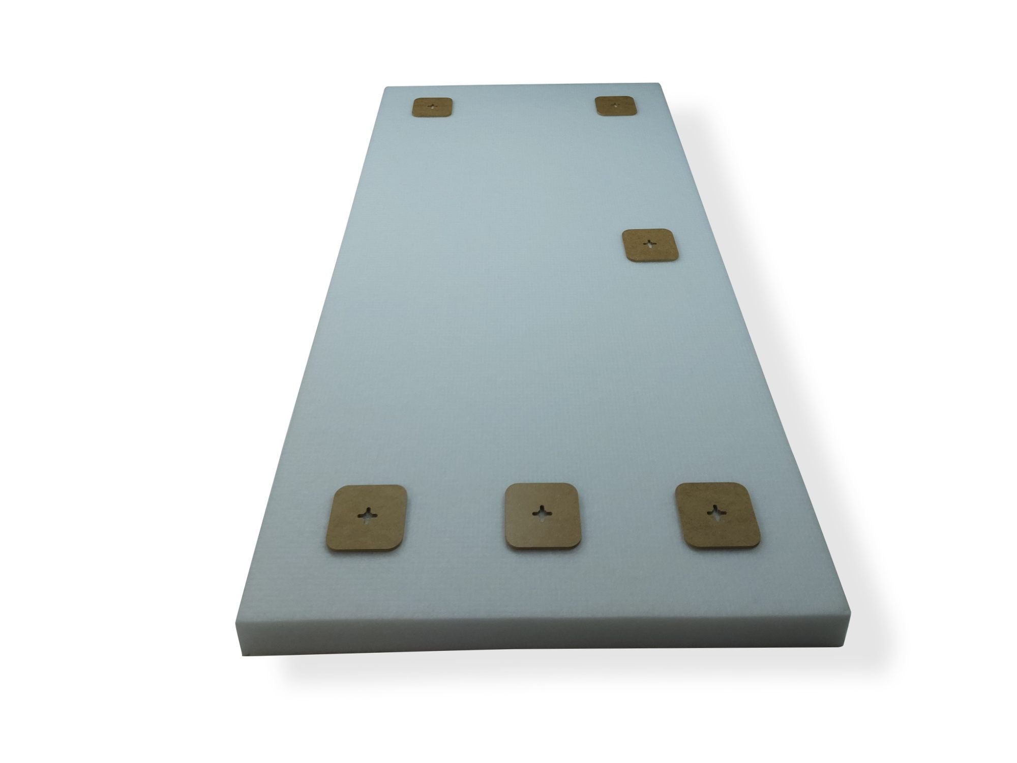 Ljudabsorbenten kan även levereras med CNC-frästa nyckelhålsfästen i MDF, fastlimmade på baksidan med 100 % solitt och lösningsmedelsfritt lim. Antalet fästen anpassas efter panelens storlek och ger en stabil och diskret montering utan synliga beslag.